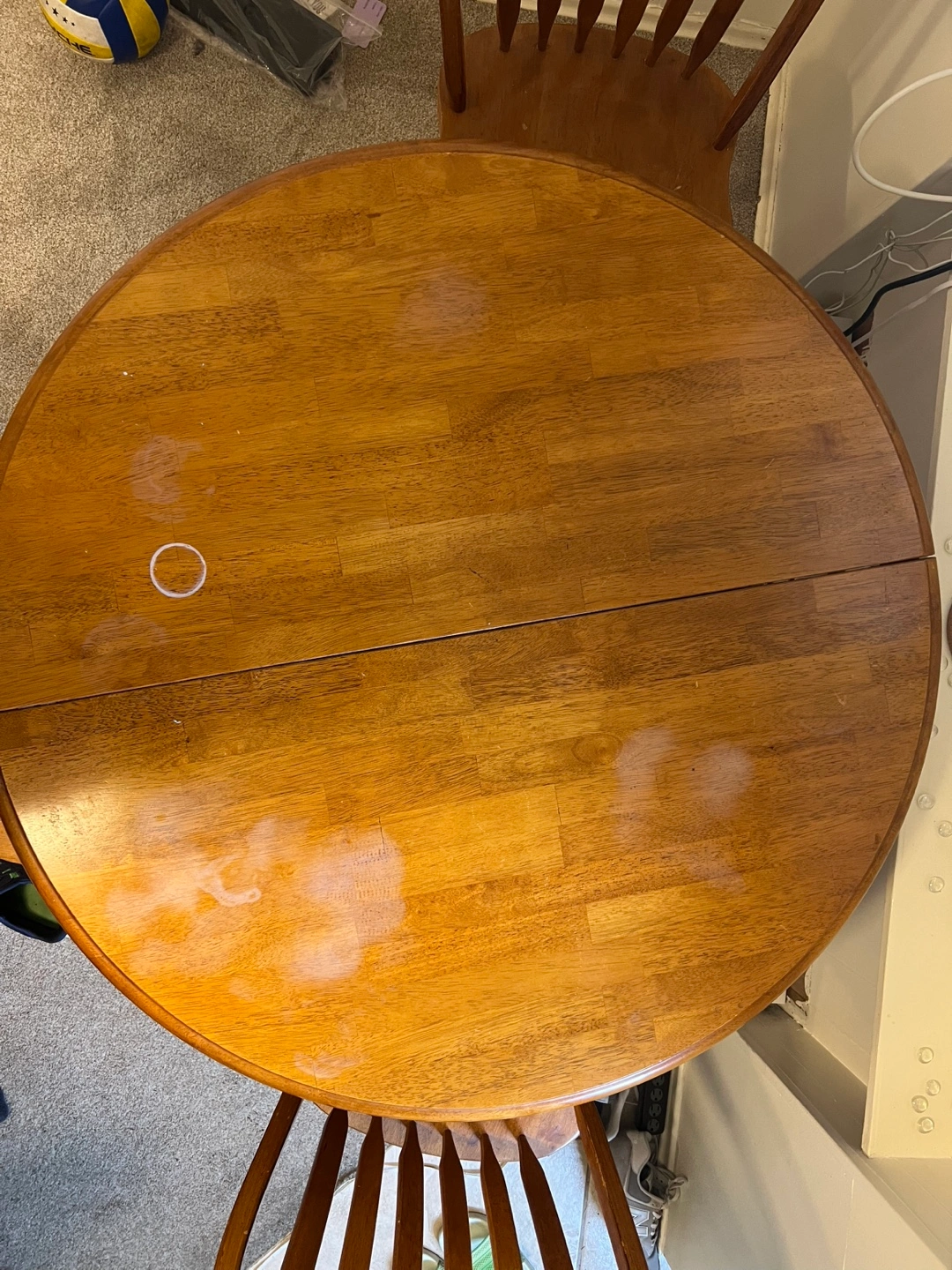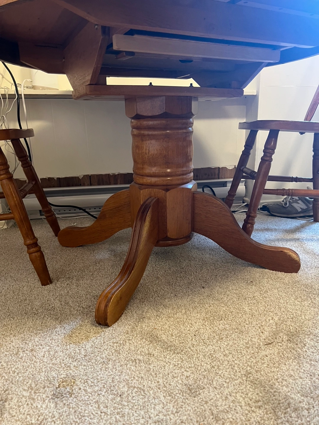 Selling a round wooden dining table with three chairs. It's a great set for a smaller dining area or kitchen. The table has a pedestal base and the chairs have a classic spindle back design. There are some signs of use on the table top, but overall it's in good condition and ready for a new home!