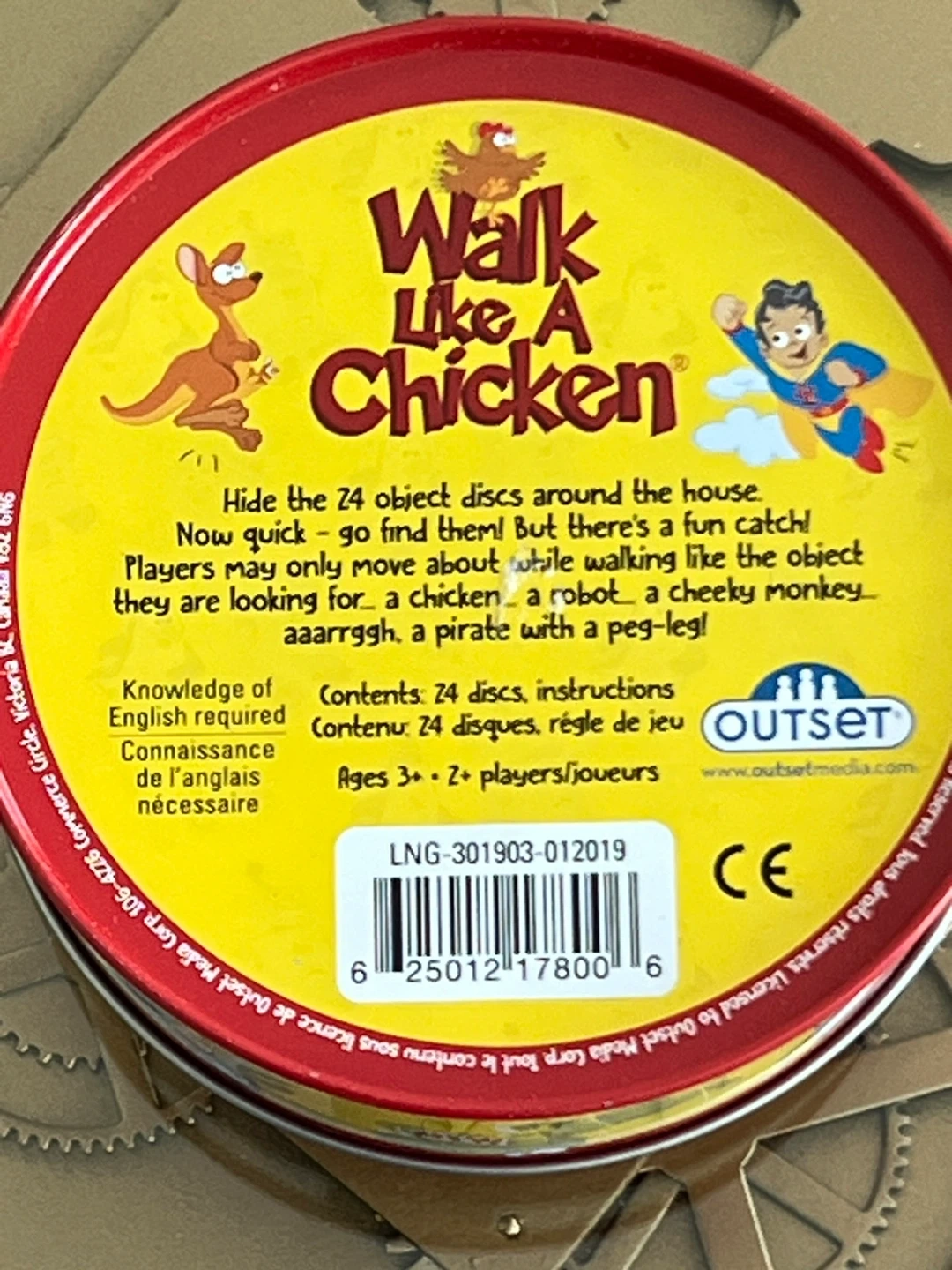 This is the Walk Like A Chicken board game tin. It includes 24 discs and instructions. Recommended for 2+ players, ages 3 and up.