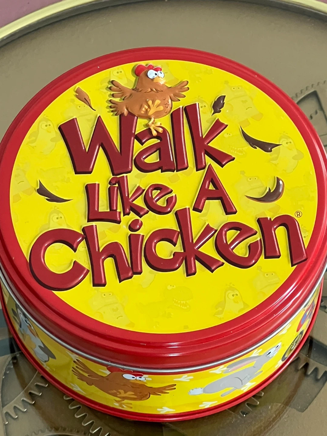 This is the Walk Like A Chicken board game tin. It includes 24 discs and instructions. Recommended for 2+ players, ages 3 and up.
