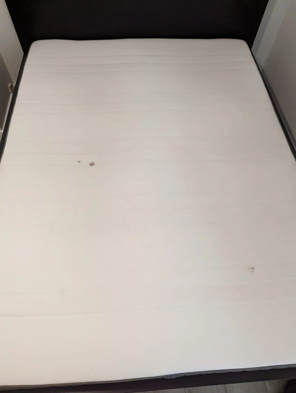 The king-size bed set and mattress were bought from Ikea. I am selling a complete set. Note: there is a minor dent at the end corner of the bed. I am sorry that the buyer needs to arrange his or her transport after the sale since we don't have any transportation by ourselves.