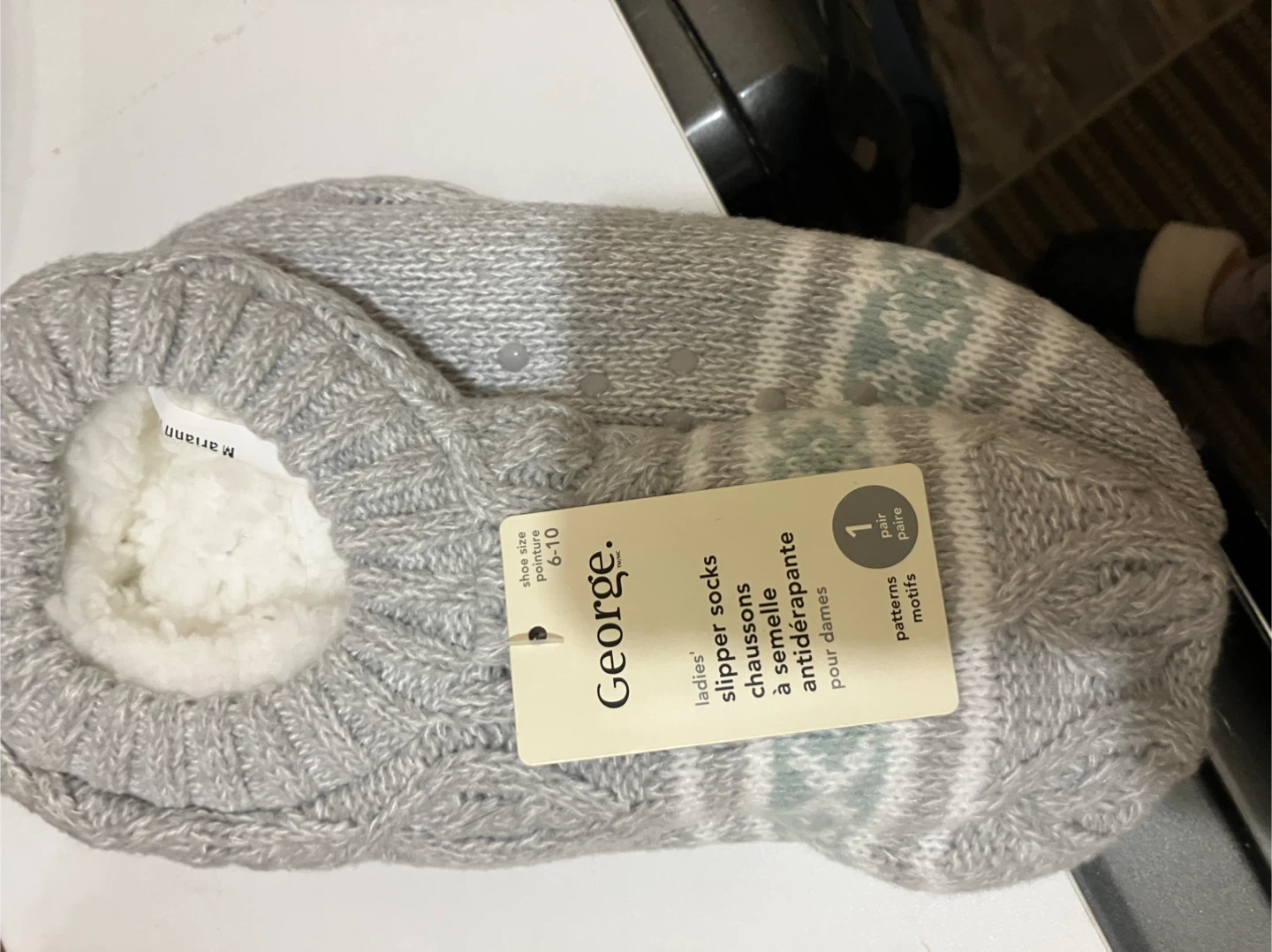 Cozy George brand slipper socks for ladies, size 6-10. These are perfect for keeping your feet warm and comfy around the house! They have a soft, plush interior and non-slip soles.