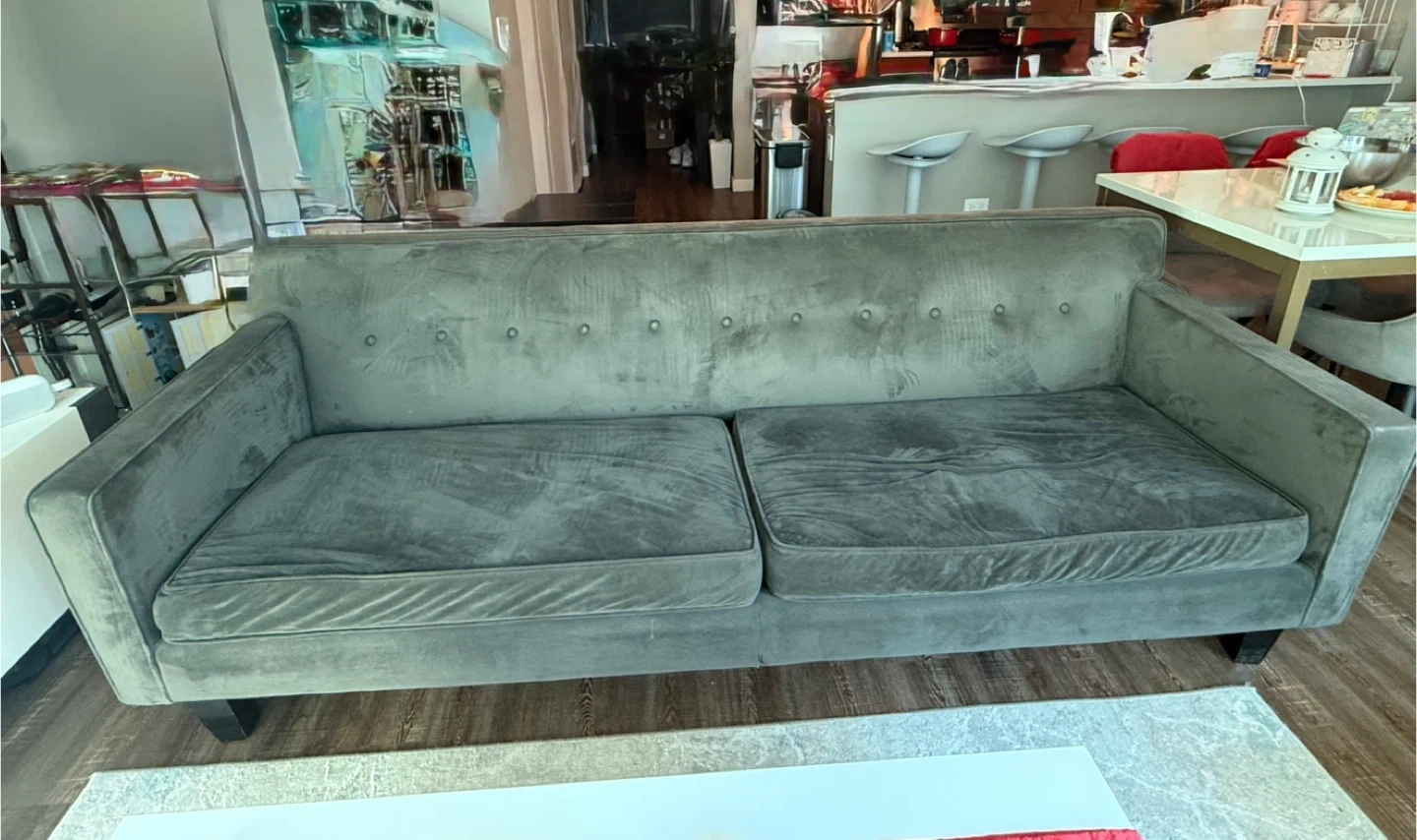 Selling a comfortable gray velvet sofa! It's in good condition and would be a great addition to any living room or den. The material is soft and inviting, perfect for relaxing after a long day