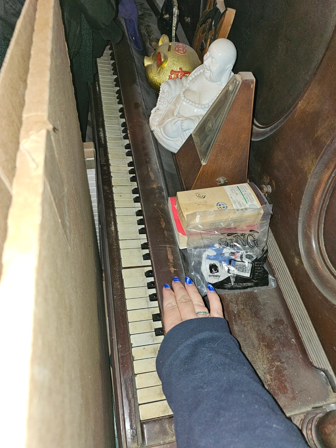 This is a beautiful antique wooden piano. It's a great statement piece for any room! It has a rich wooden finish and classic ivory keys. This piano would be a wonderful addition for a music enthusiast or collector.