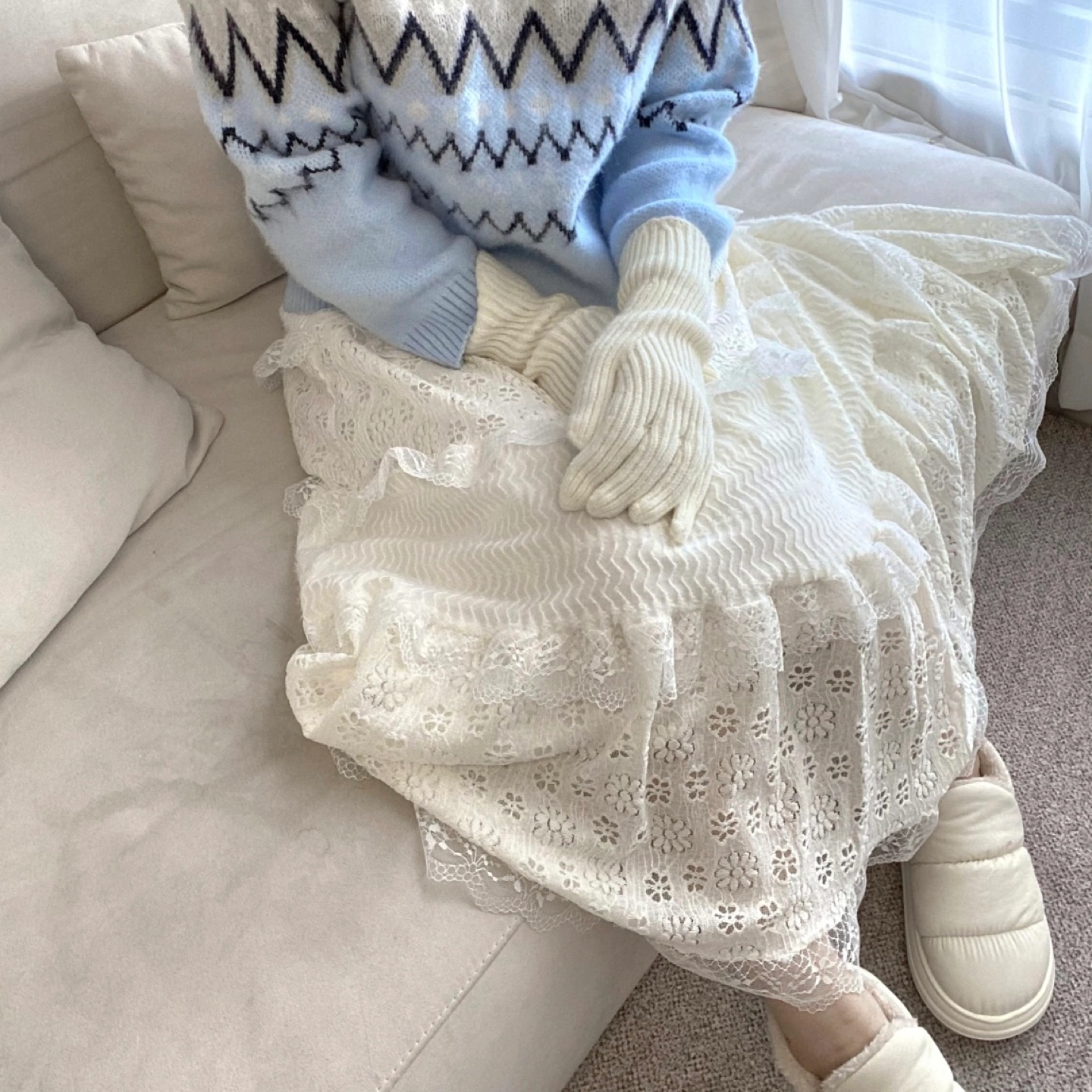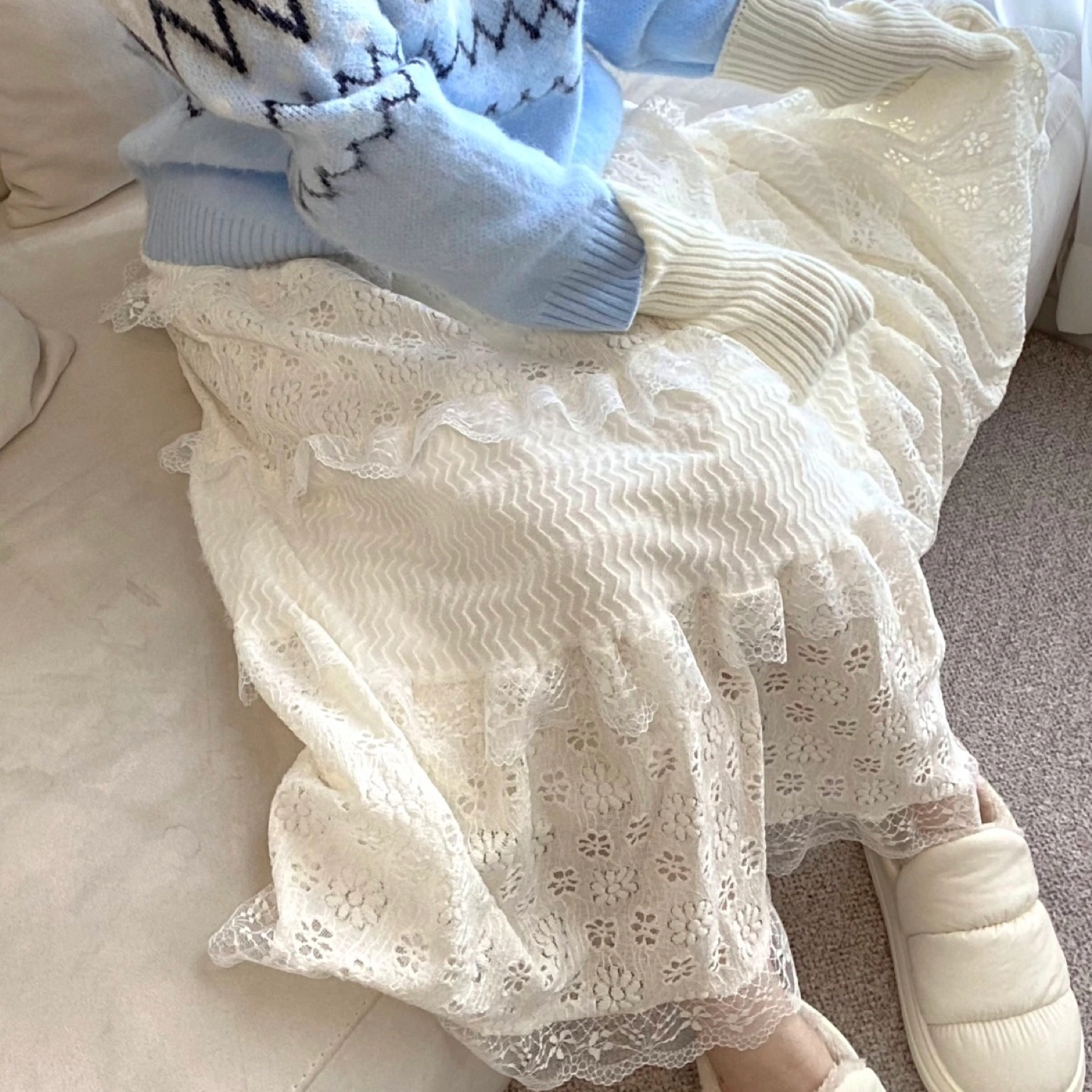 • Outer: Likely cotton-blend lace