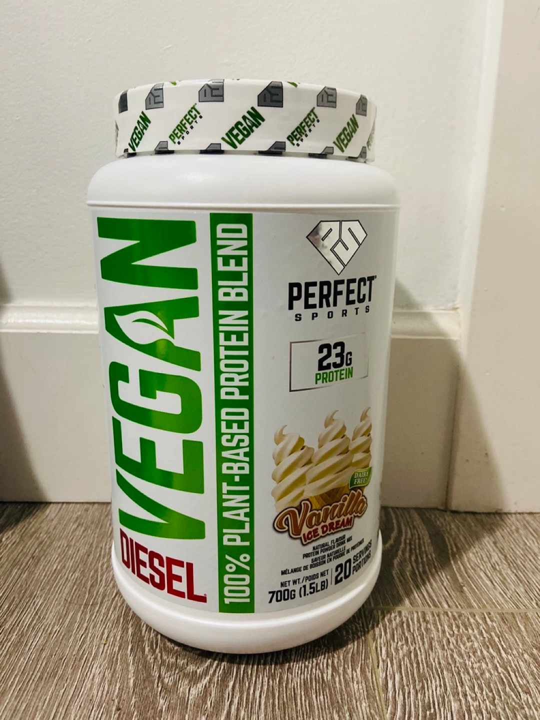 Selling a tub of Perfect Sports Vegan Diesel protein powder in Vanilla Ice Cream flavour. It's a 100% plant-based protein blend, perfect for anyone looking for a vegan option. The tub contains 700g (1.5lb) and has 20 servings. Expiry Date is October 2027