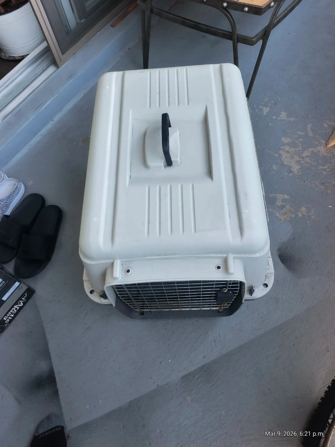 This is a sturdy pet carrier crate, perfect for travelling with your furry friend. It features a secure metal door and a comfortable carrying handle. Plastic construction.
