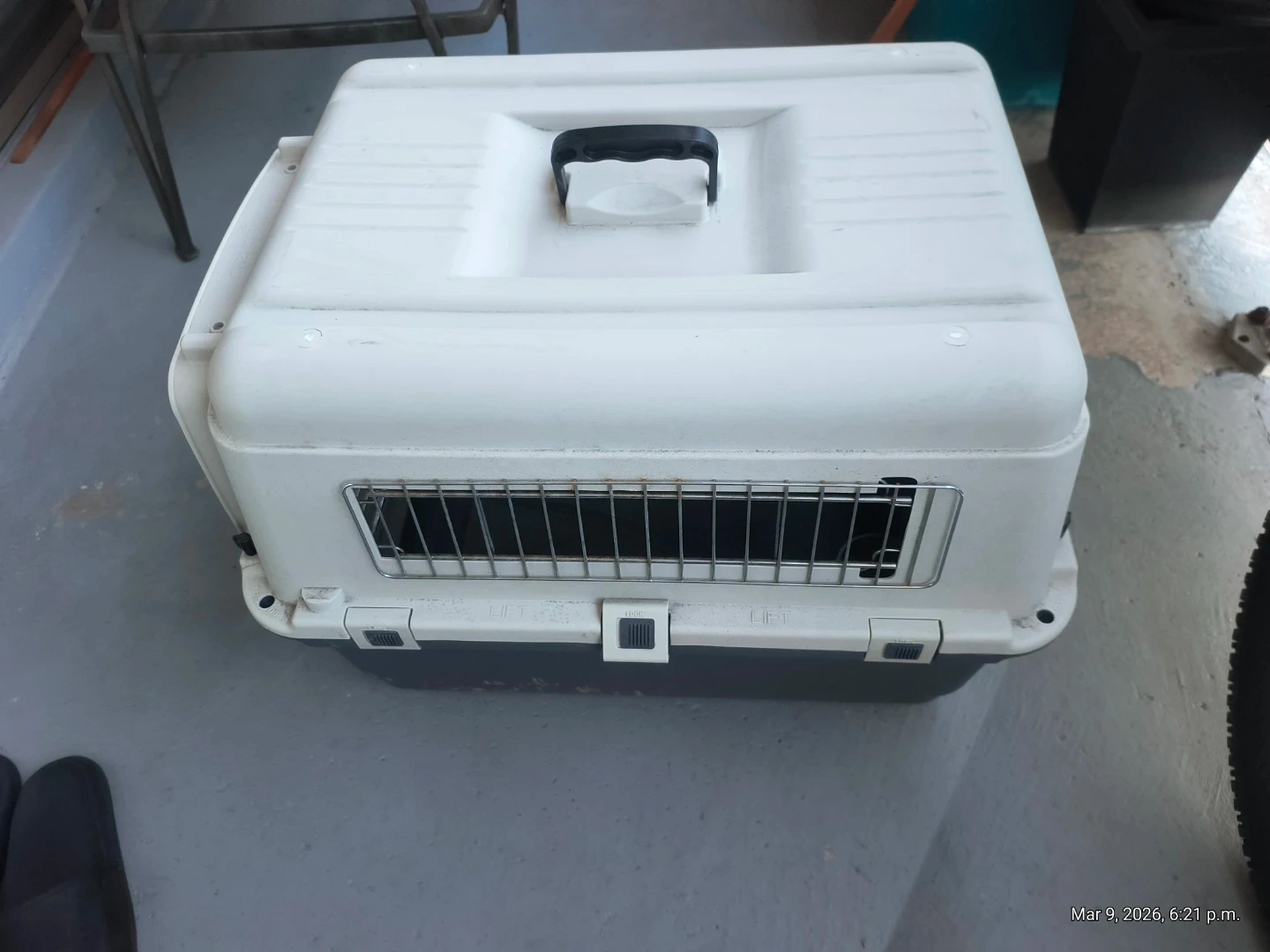 This is a sturdy pet carrier crate, perfect for travelling with your furry friend. It features a secure metal door and a comfortable carrying handle. Plastic construction.