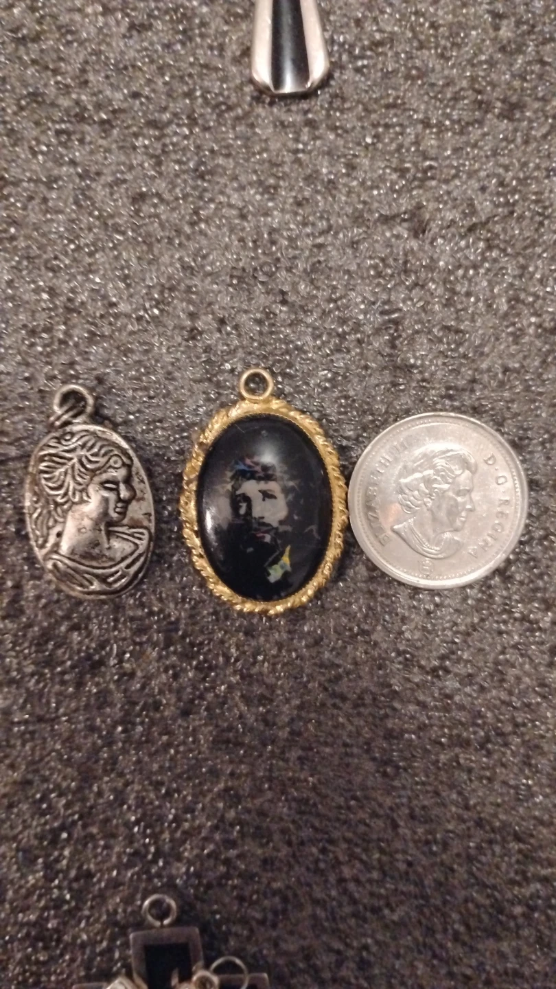 1 free each.A vintage oval-shaped pendant featuring a portrait and a decorative silver-tone charm. The oval pendant has a braided gold-tone frame around a dark background with a visible portrait. Next to it is a silver-tone oval charm with a sculpted profile. These would make a nice addition to a jewellery collection.