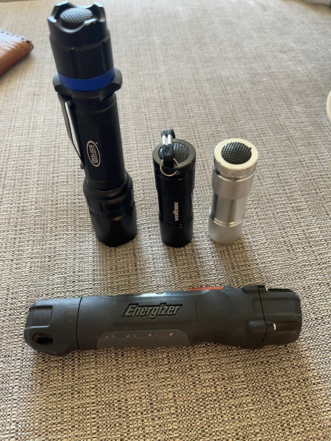 Four flashlights from brands Energizer, Police, and Voltax, plus an unbranded aluminum one. They come in various sizes and materials. Handy for power outages or outdoor adventures!