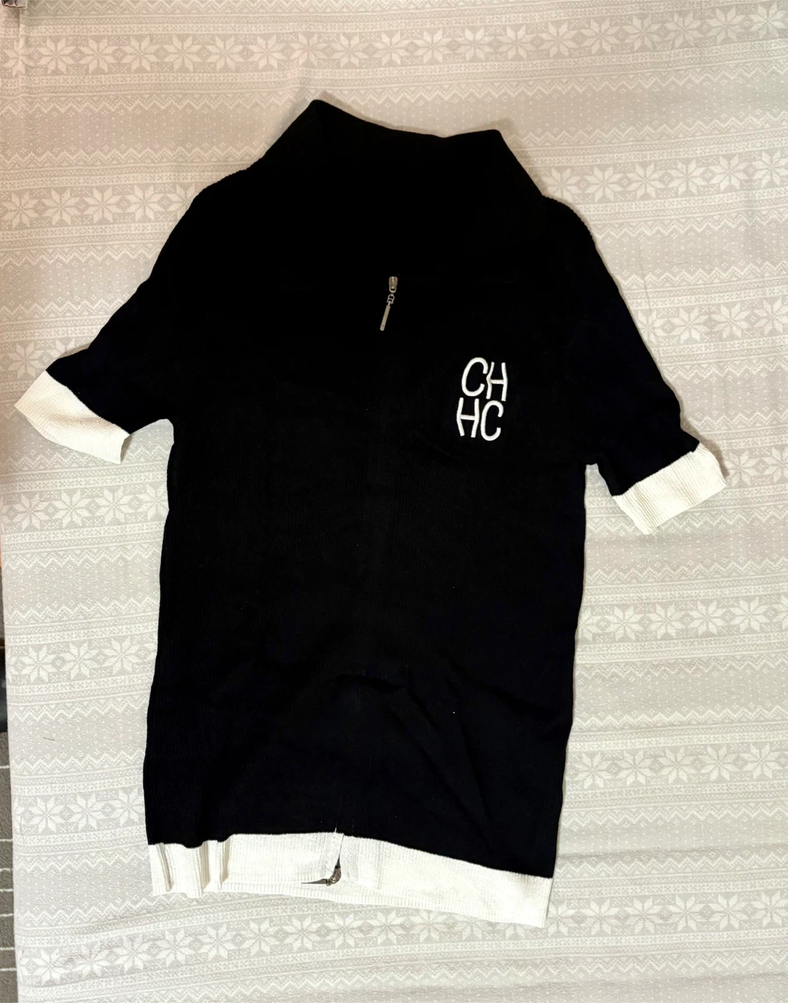 Here's a stylish knit top! It features a chic black body with contrasting white cuffs and hem. The quarter-zip adds a touch of modern flair to this classic design. Material is thin and breathable although slightly itchy. Suggest wearing a tank top under for better experience. As good as new and amazing styling top.