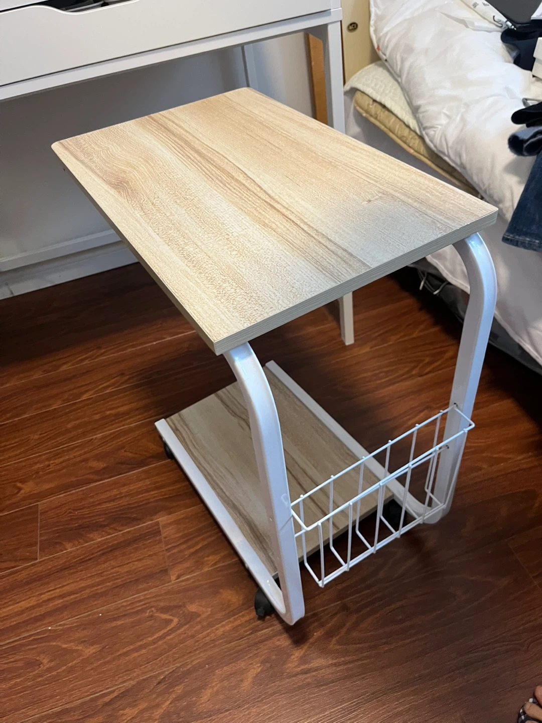 A handy side table with a light wood grain finish and white metal frame. It features a lower shelf and a wire basket for storage. This table has wheels for easy mobility.