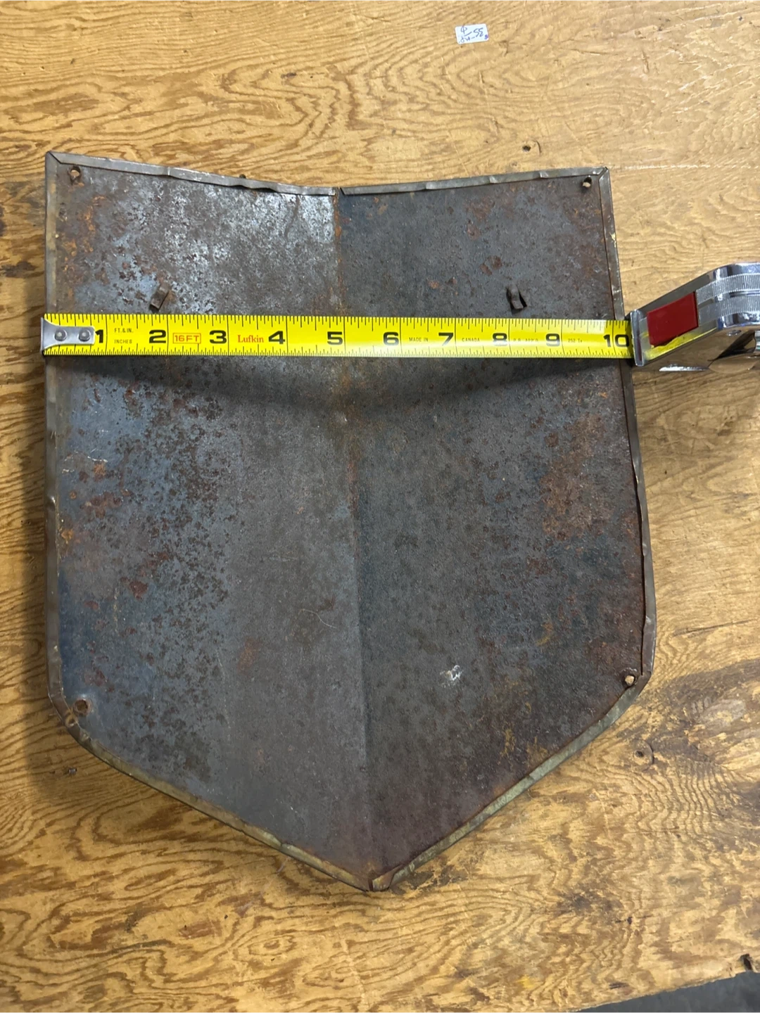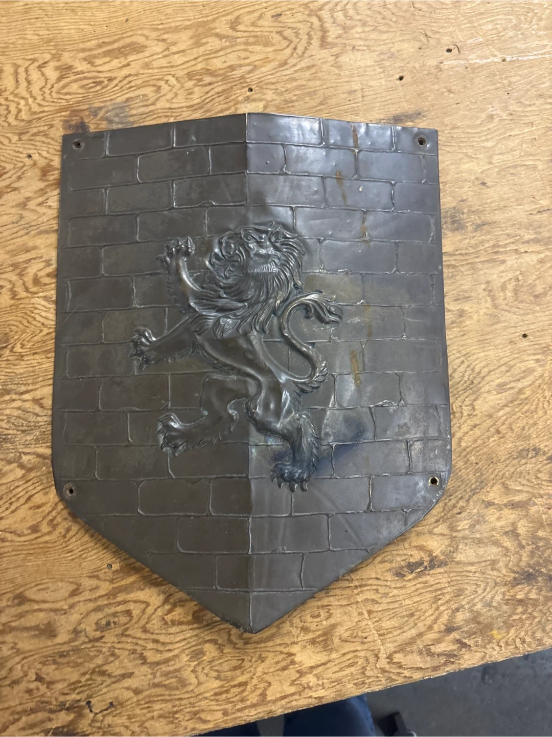 A vintage metal wall shield featuring a raised lion rampant emblem against a brick-like background. This decorative piece is made of metal and has a rustic, weathered finish. It measures approximately 9 inches wide and 11 inches tall. It's ready to be hung for a unique decorative accent!