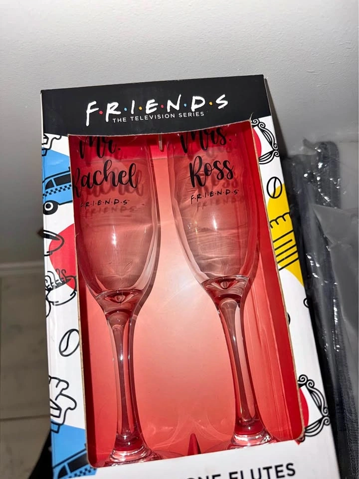 Hello, Mrs. Ross! Hello, Mr. Rachel! Grab this set of champagne flutes featuring the hilarious Vegas wedding names. Perfect for a themed viewing party, anniversary, or as a fun gift for your favorite "Lobsters." New in box and ready for gifting.