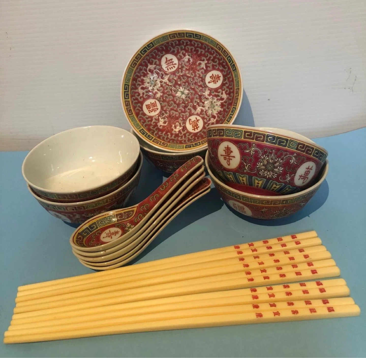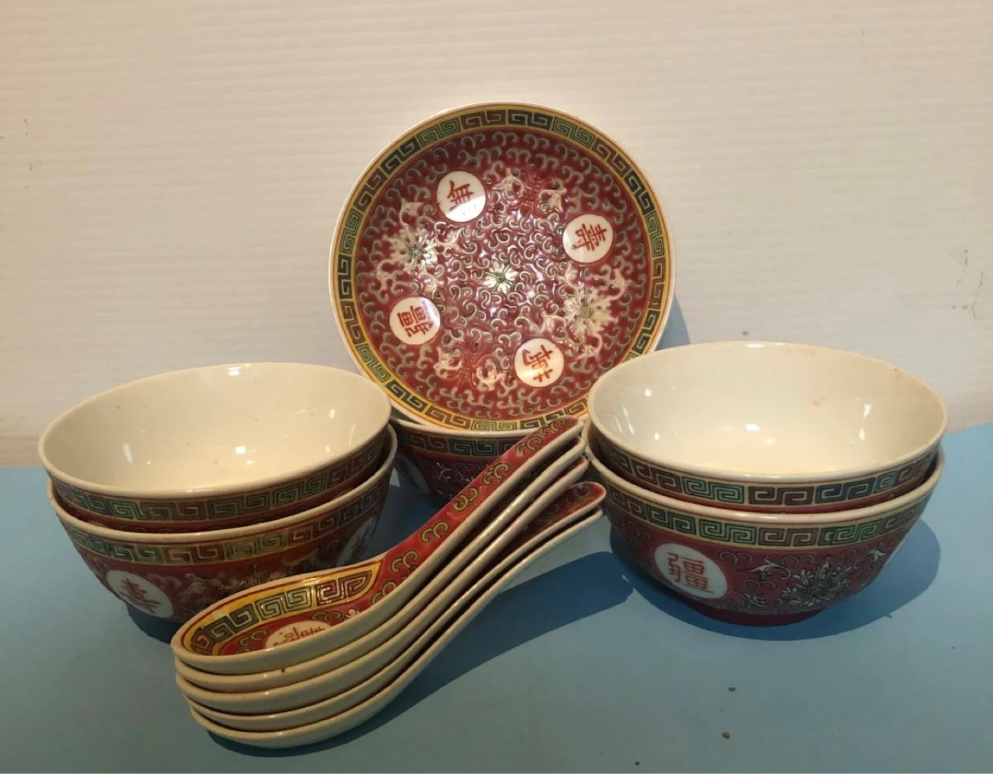 This is a set of five ceramic bowls featuring a red and gold traditional Chinese pattern. It also includes five matching ceramic spoons. These bowls are great for serving soup or rice. They're made of durable ceramic.