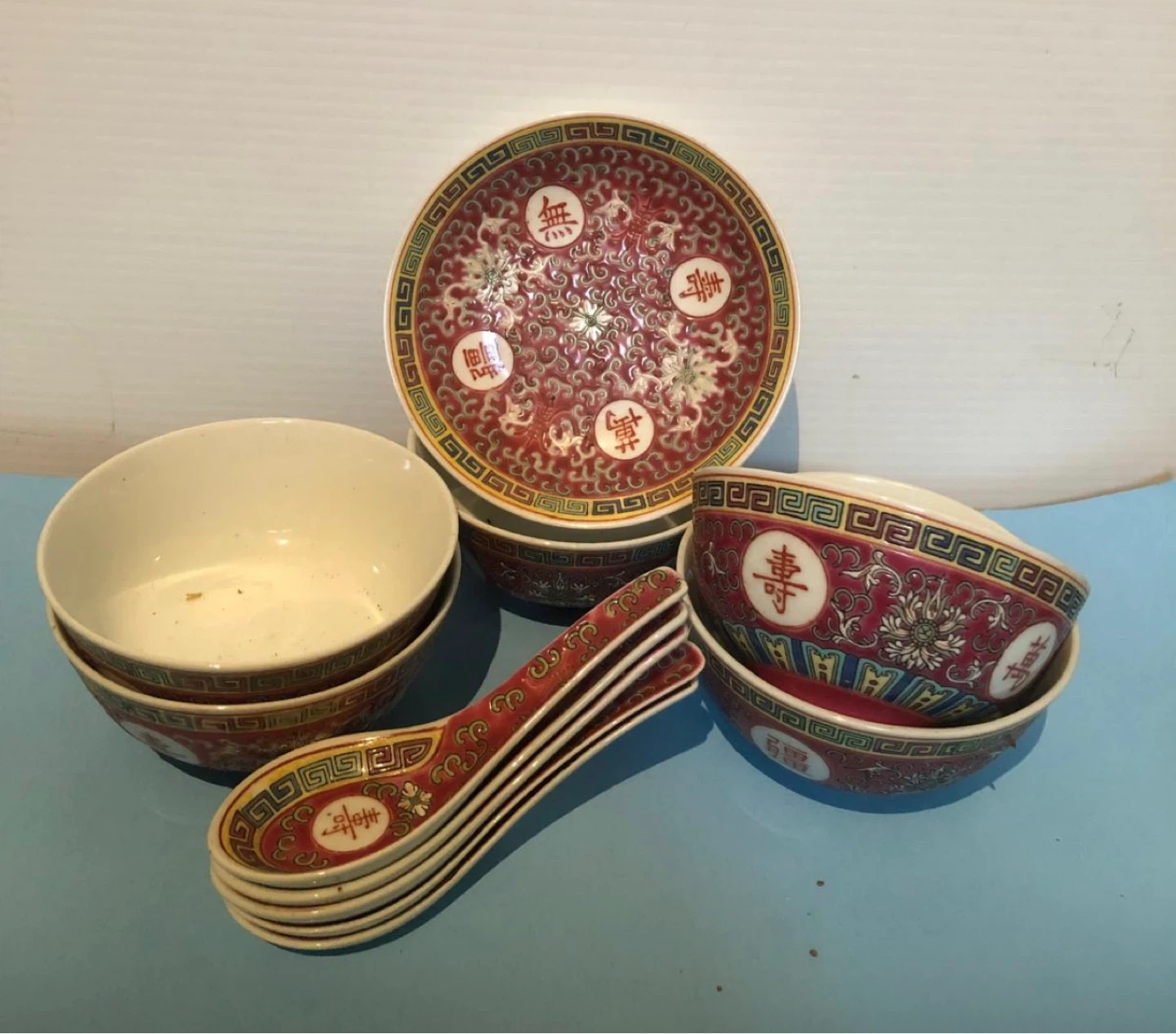 This is a set of five ceramic bowls featuring a red and gold traditional Chinese pattern. It also includes five matching ceramic spoons. These bowls are great for serving soup or rice. They're made of durable ceramic.