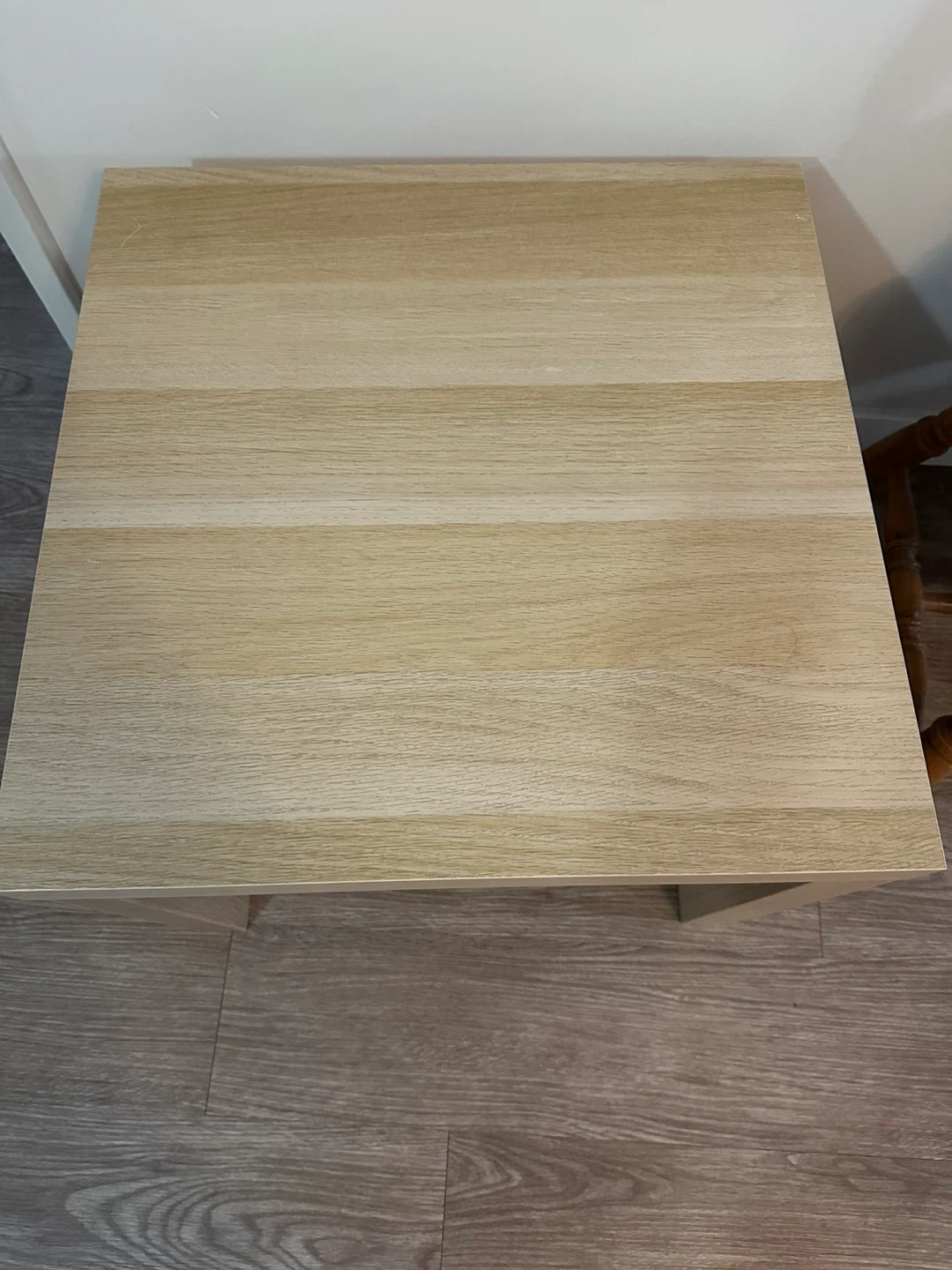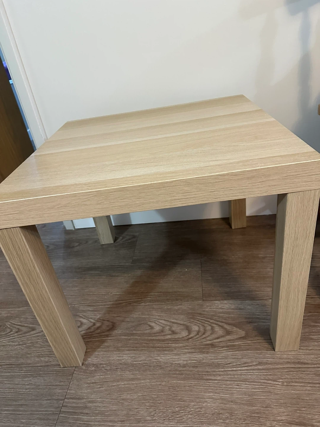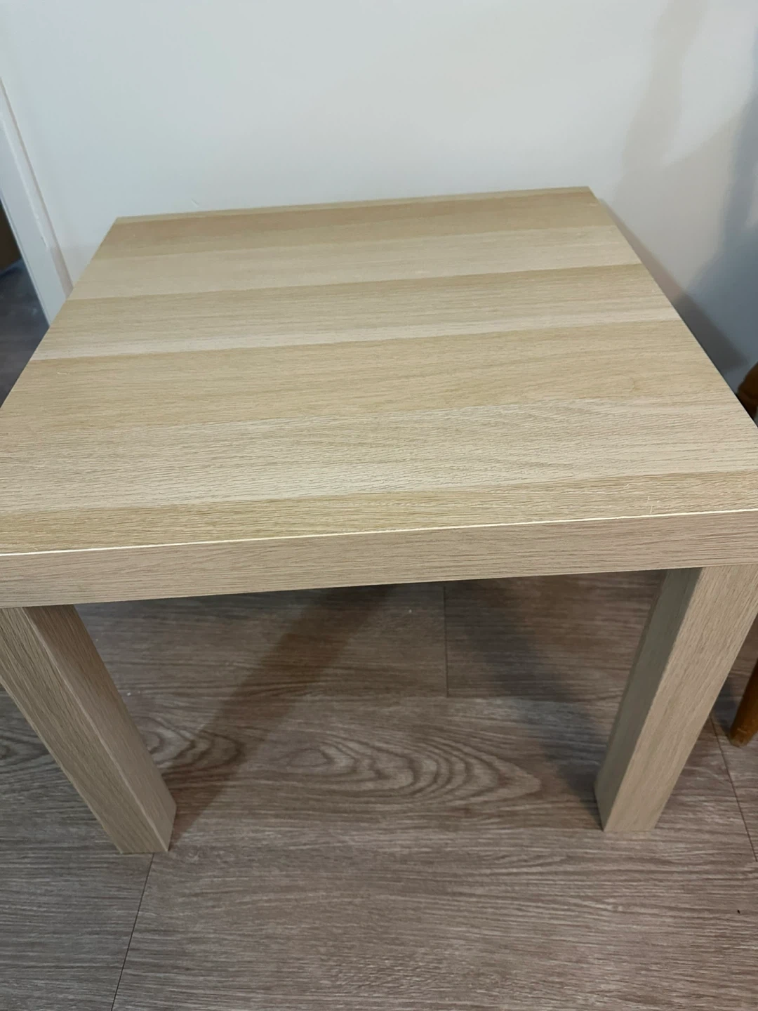 A simple light wood side table. Its compact size makes it handy for placing next to a sofa or chair. Looks good in most rooms!