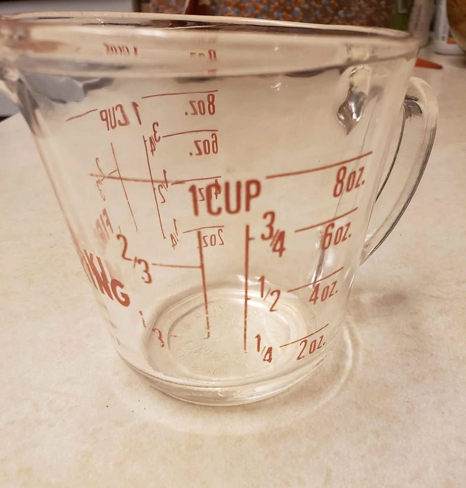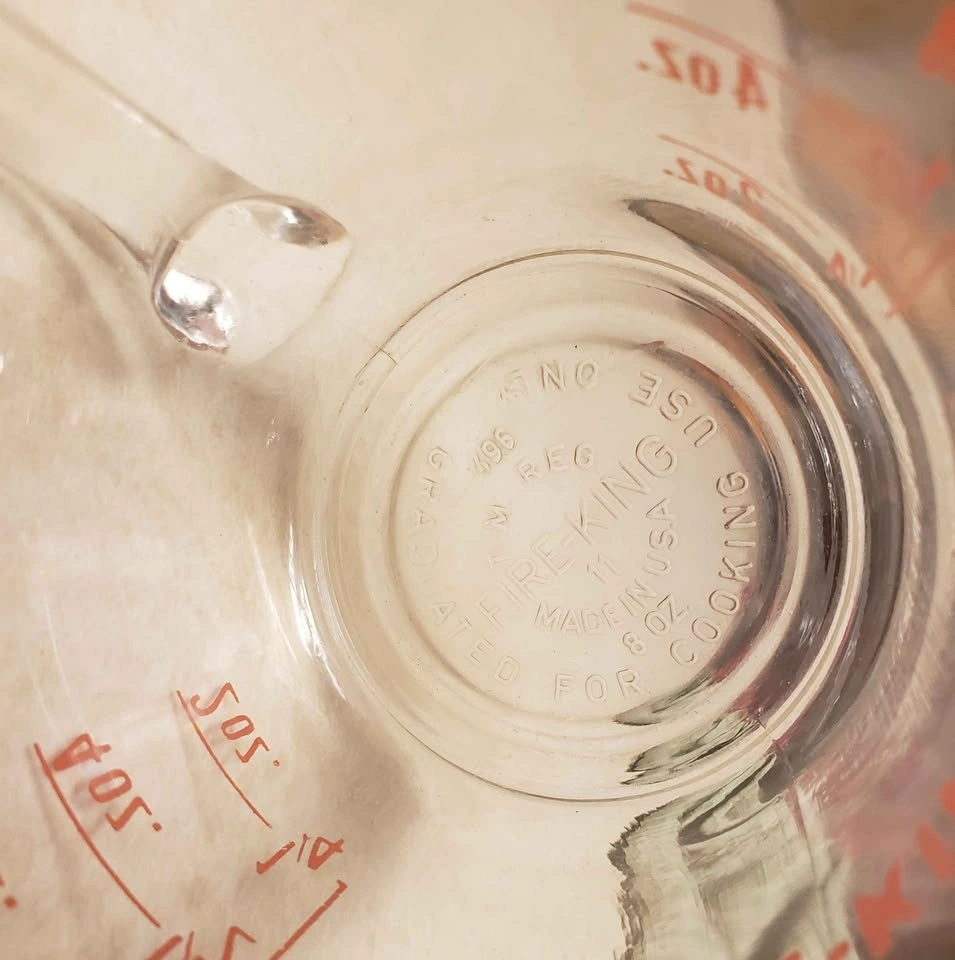 Vintage Fire King 1 cup glass measuring cup with handle and pour spout. The 1/3 marking is still visible but beginning to rub off consistent with age and use. Price reflects condition. Otherwise in good shape. Clean. No chips or cracks. Red logo and red writing on this version. Pick up in Upper Lonsdale North Vancouver.