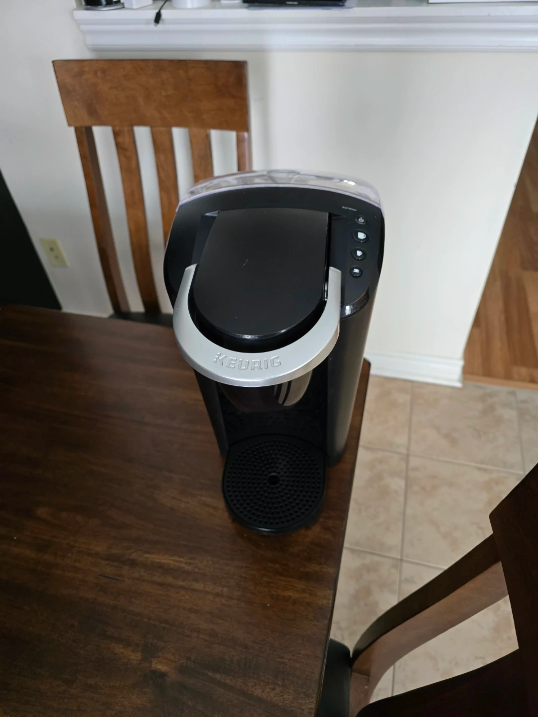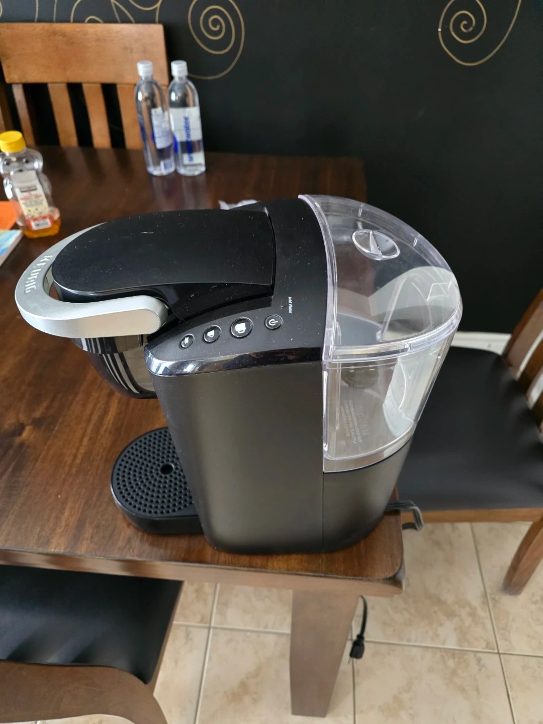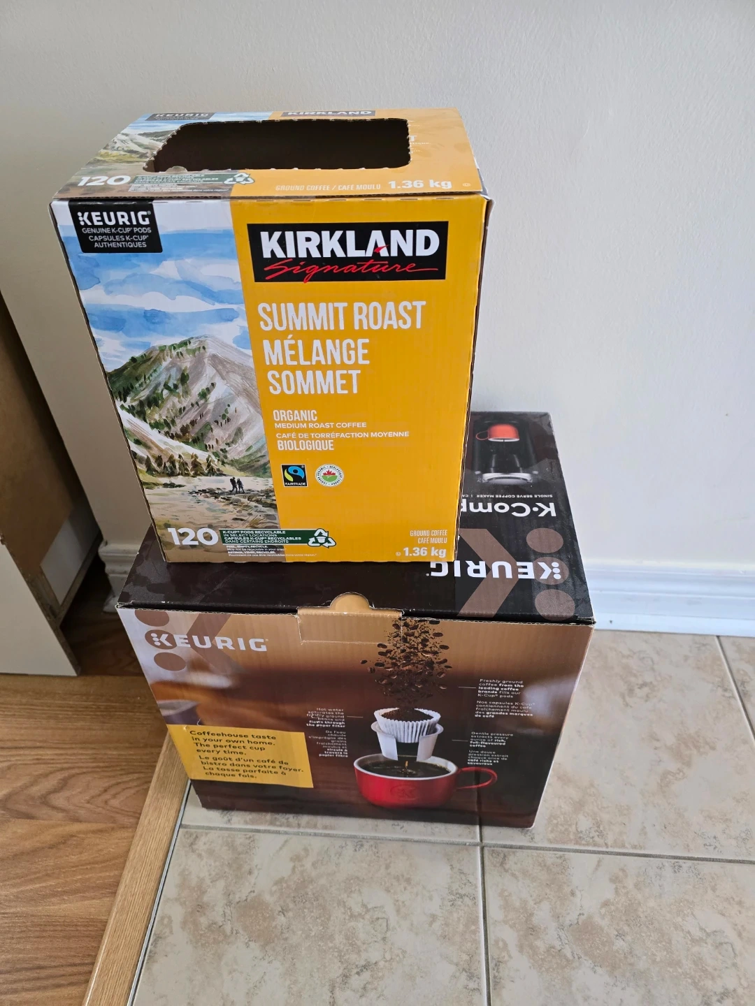 This Keurig K-Compact coffee maker is black and comes with a box of 60 Kirkland Signature Summit Roast Organic Medium Roast coffee pods. It's a great way to brew your morning coffee at home.