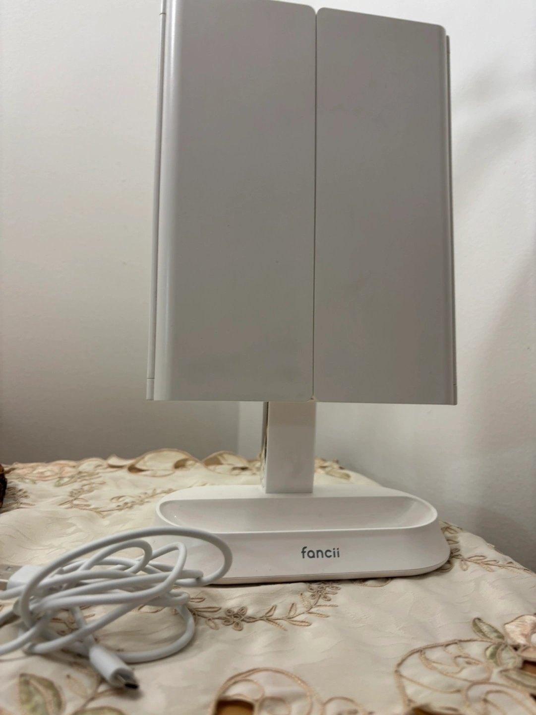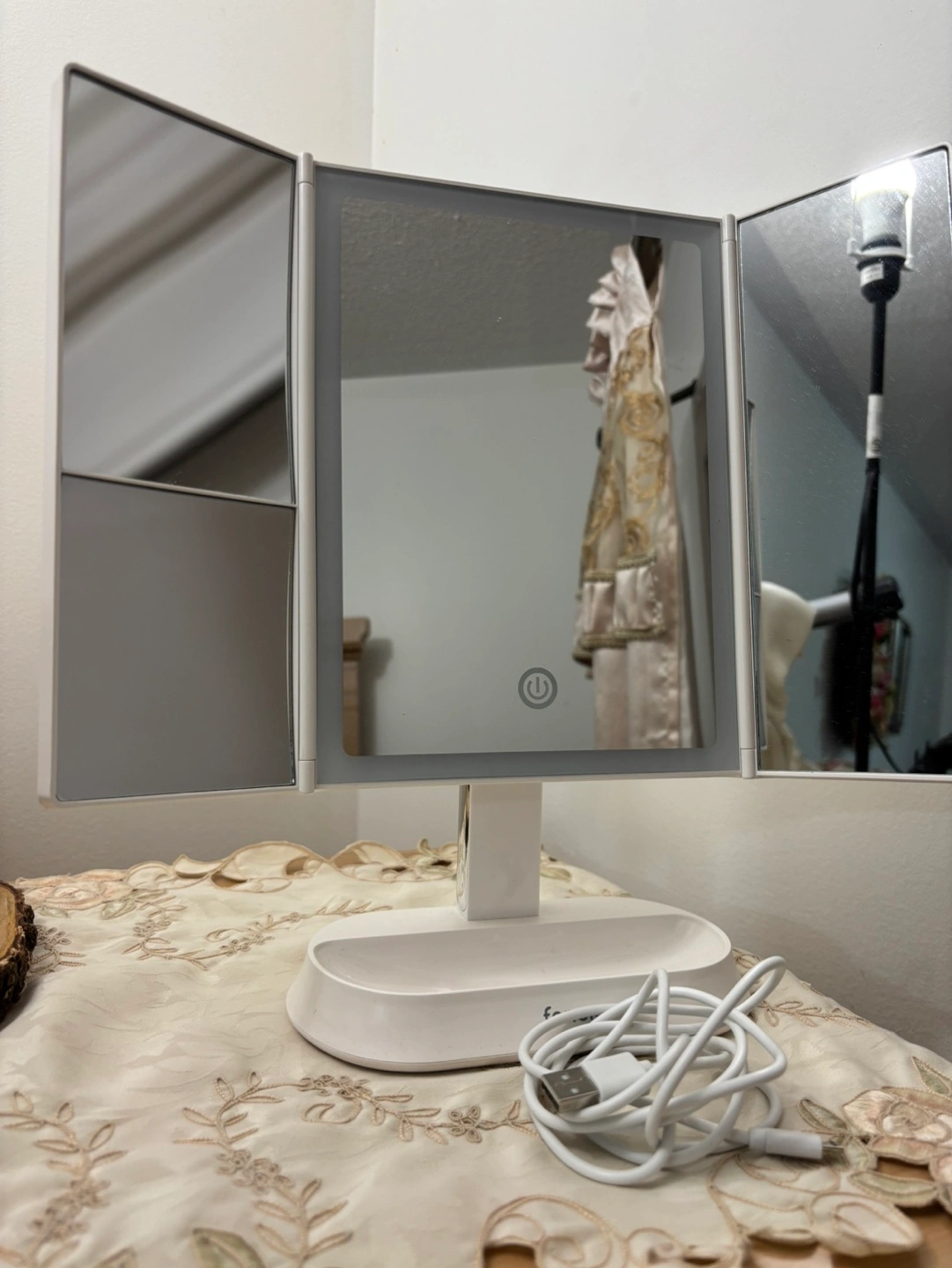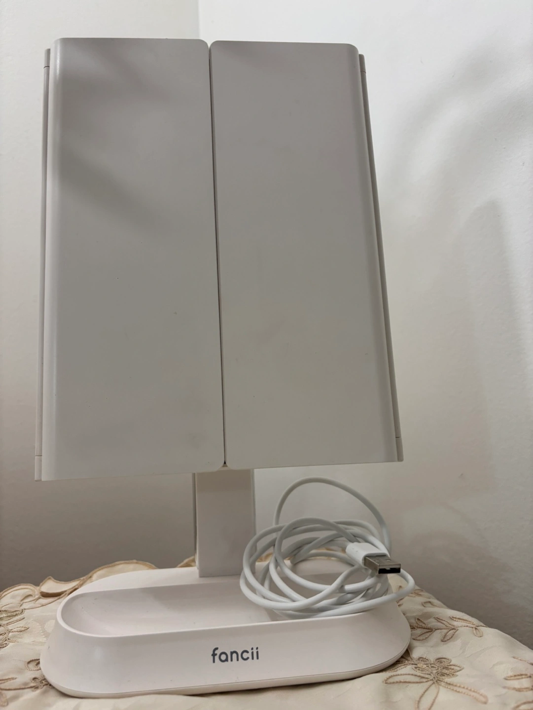 Triple panel vanity mirror with lights, USB powered, comes with cord. Folds flat for storage. No box.