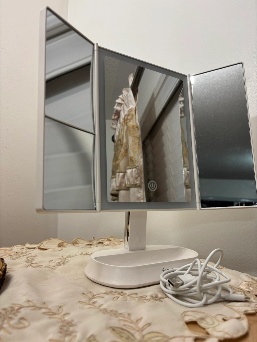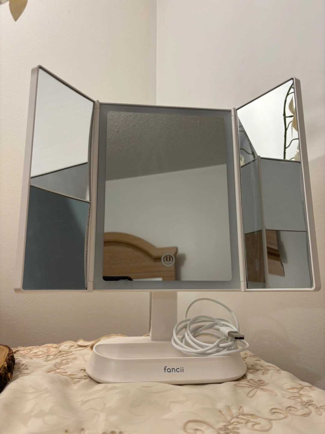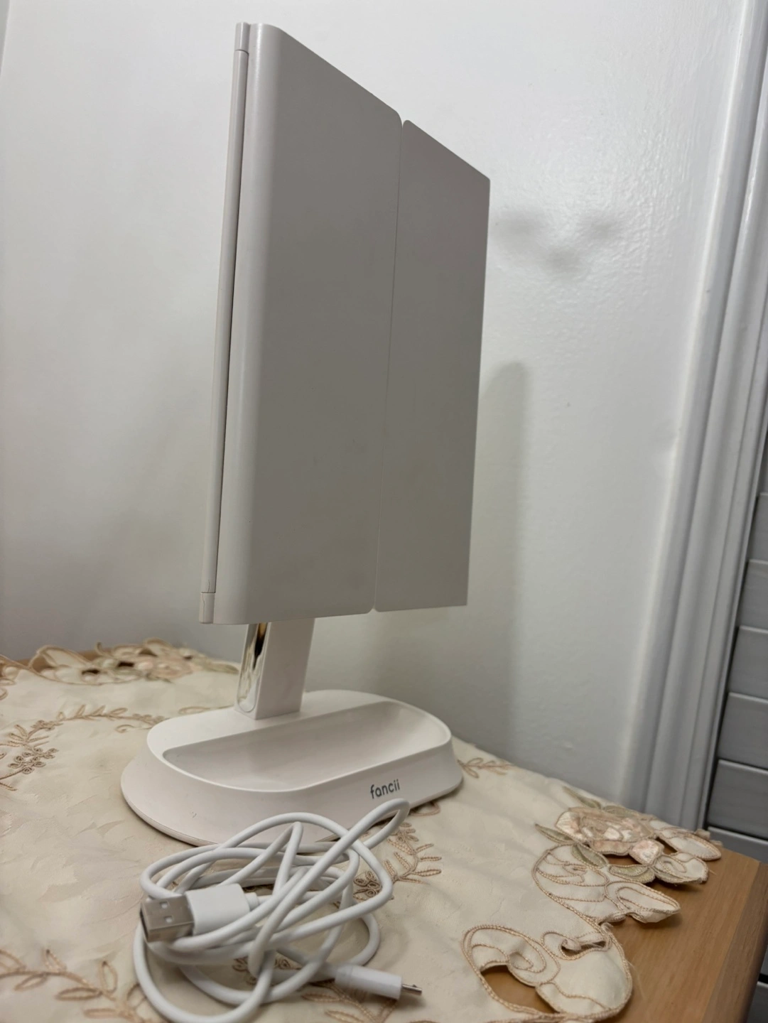 Triple panel vanity mirror with lights, USB powered, comes with cord. Folds flat for storage. No box.