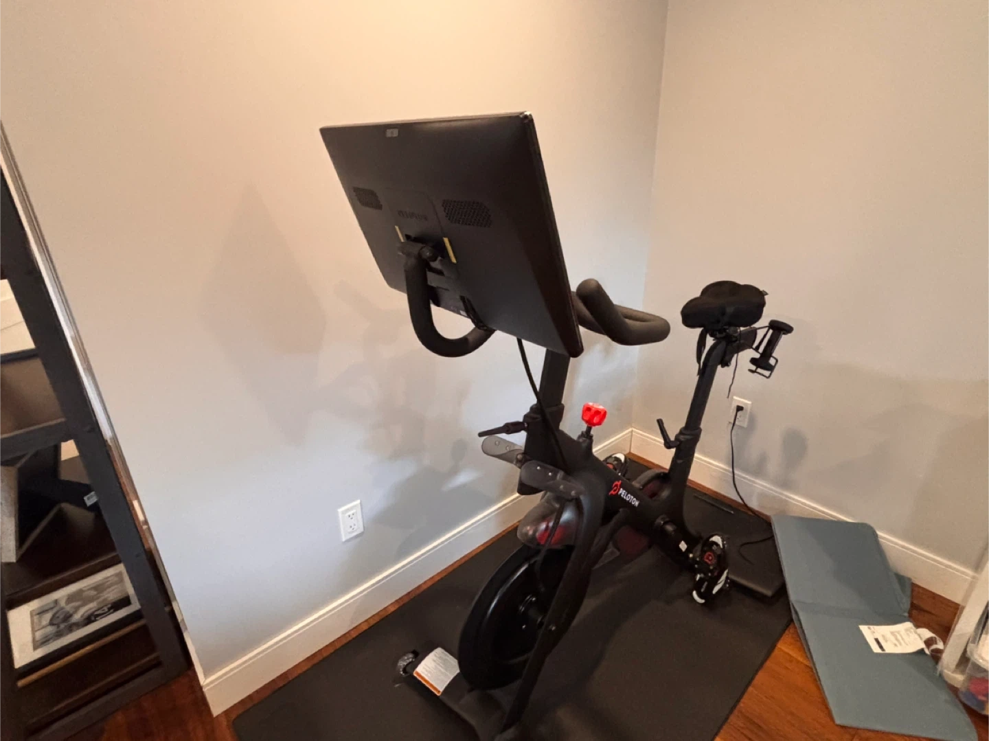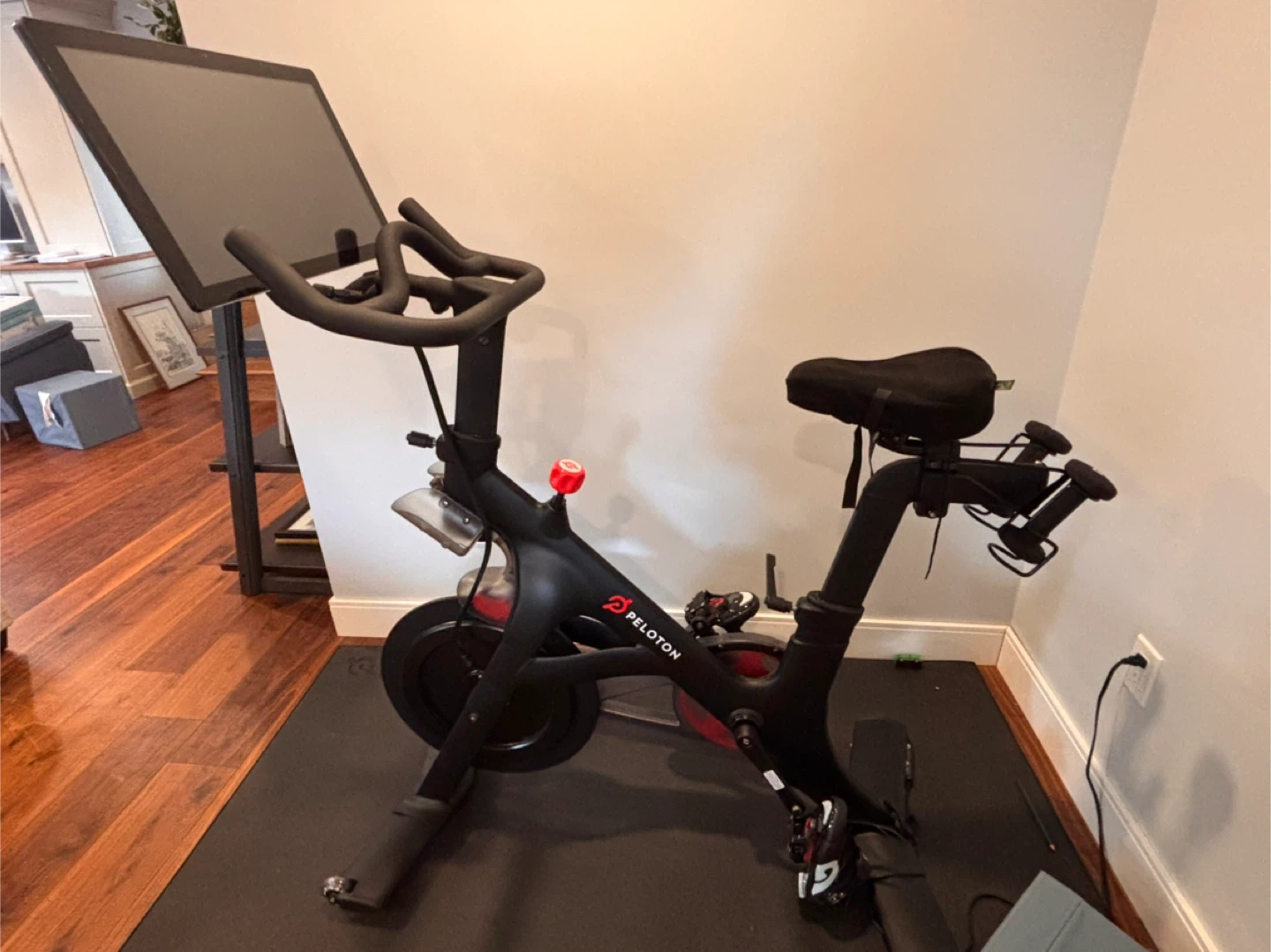 This is a Peloton exercise bike. It comes with a large screen for workouts and adjustable seat and handlebars. Great for cardio at home!