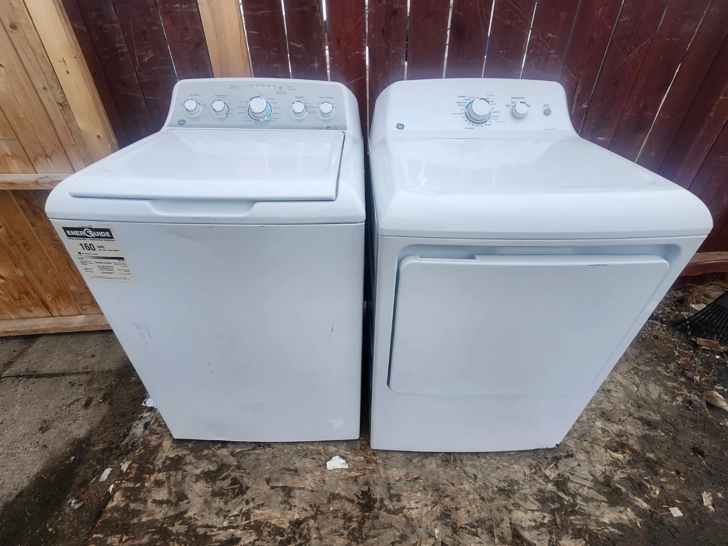 White GE top-load washer and front-load gas dryer. Both are standard-sized appliances. They're in good condition and ready for a new home!