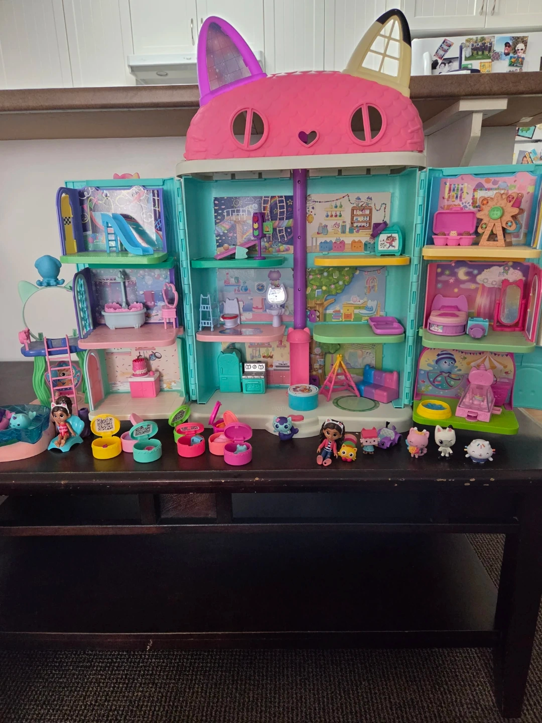 This Gabby's Dollhouse playset features multiple rooms and accessories, including several character figures. It's a multi-level house with slides, beds, and play areas. Perfect for imaginative play!