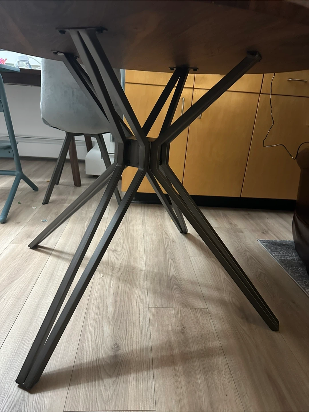 A stylish round dining table with a rich walnut wood top and a unique geometric metal base. It's sturdy and offers a modern aesthetic. This table is perfect for smaller dining spaces or as a charming accent piece.