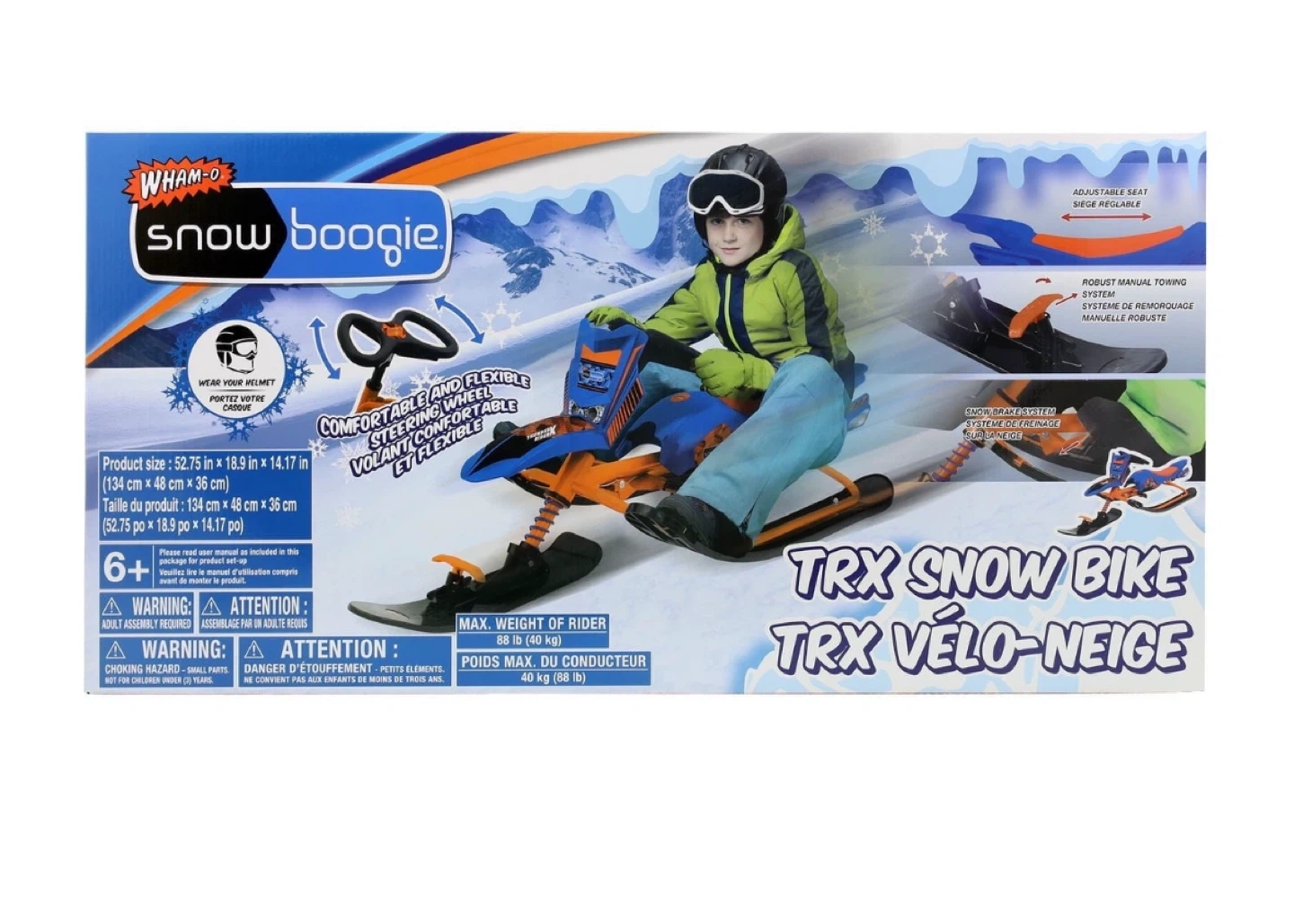 Hit the snow like an avalanche with the Wham-o® Snow Boogie® TRX Snow Bike. The Snow Bike is the perfect snow mobile vehicle for kids ages 6+. The bike has safety features such as a manual towing/brake system. User safety is assured through an adjustable seat feature and ergonomic handle grips. Weight limit of 88 lbs. Now you can enjoy hours of fun and be sure your snow day will be a blast!
