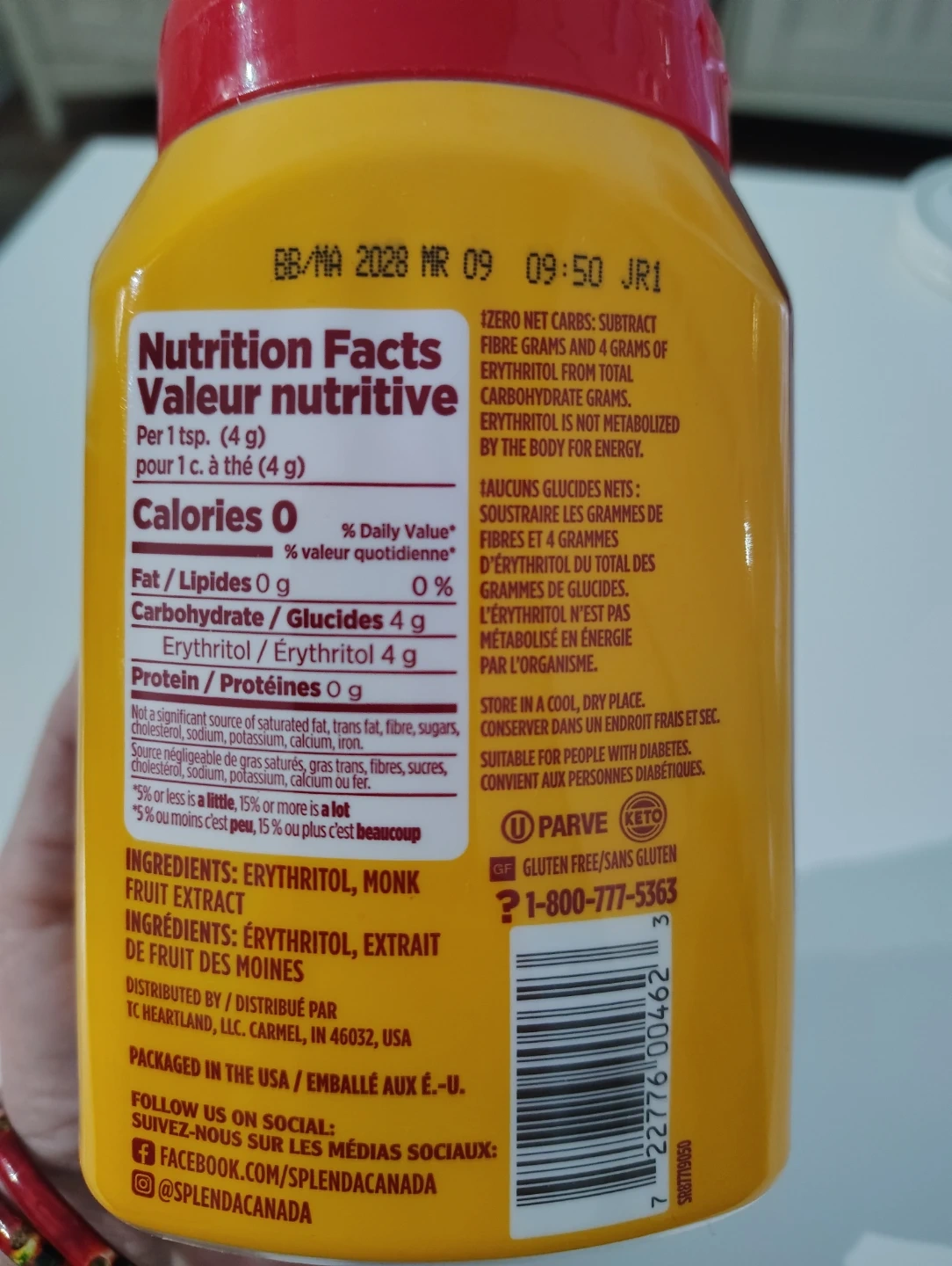 Selling a 540g container of Splenda Monk Fruit sweetener blend. It's a no-calorie sweetener that's great for baking and beverages.