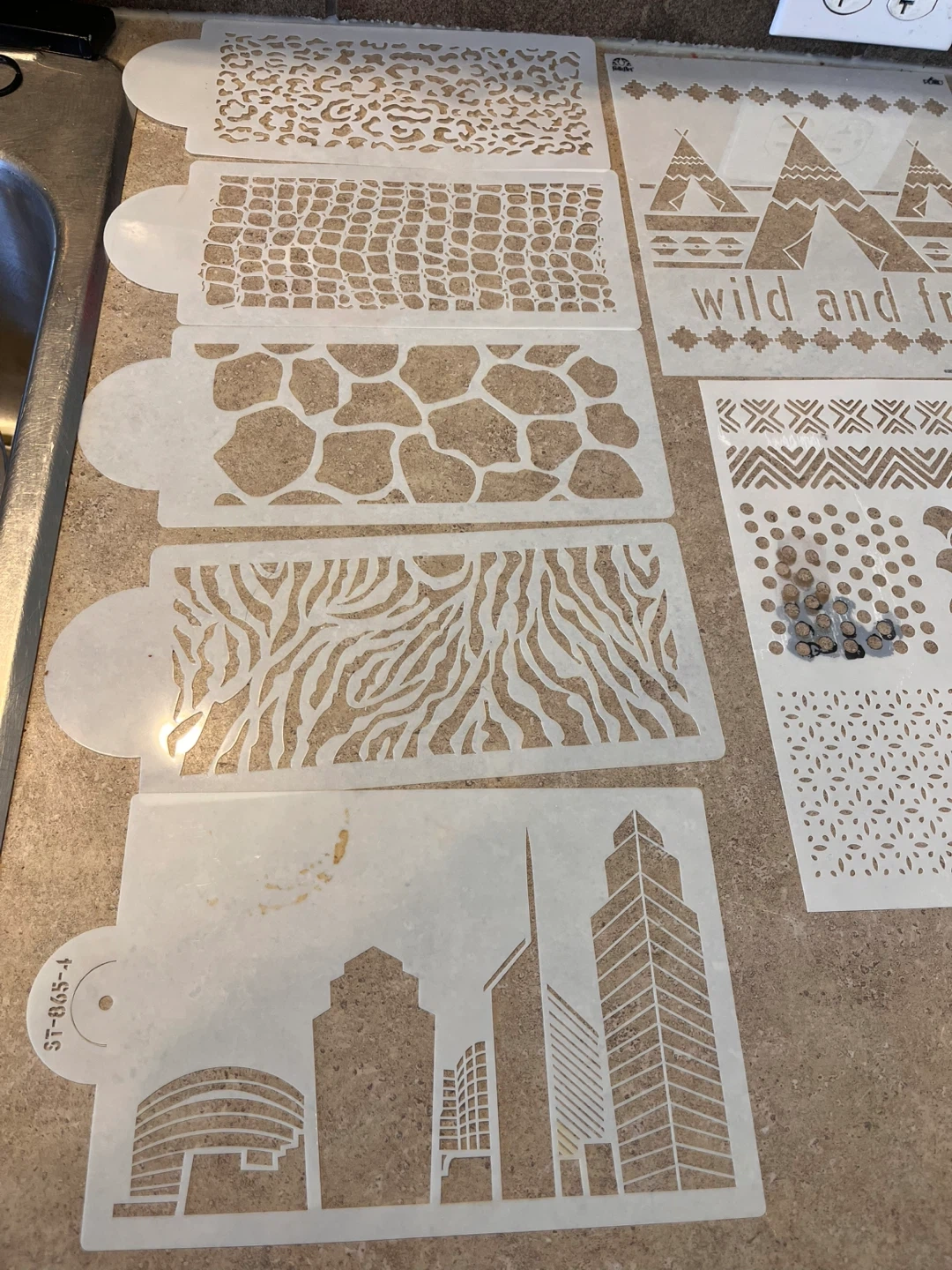 This lot includes various baking molds and stencils for cakes, chocolates, and crafts. It features stencils with animal prints, cityscapes, letters, and decorative patterns. Molds are for chocolates, candies, and cake pops. Great for creative baking projects! Located in Silverado