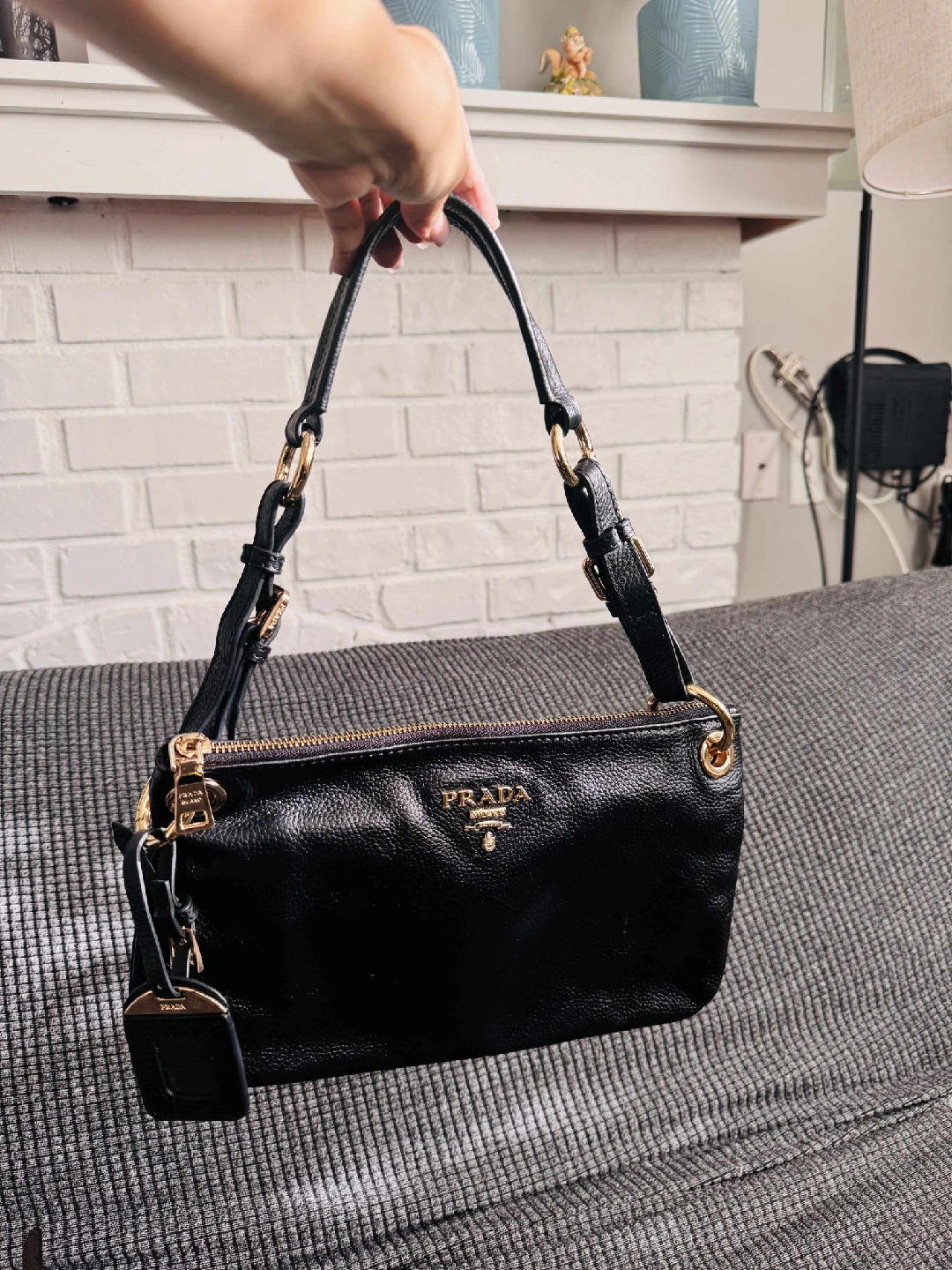 Selling a stylish Prada shoulder bag in black leather. It's in great condition and comes with the authenticity certificate card. Perfect for adding a touch of luxury to any outfit!