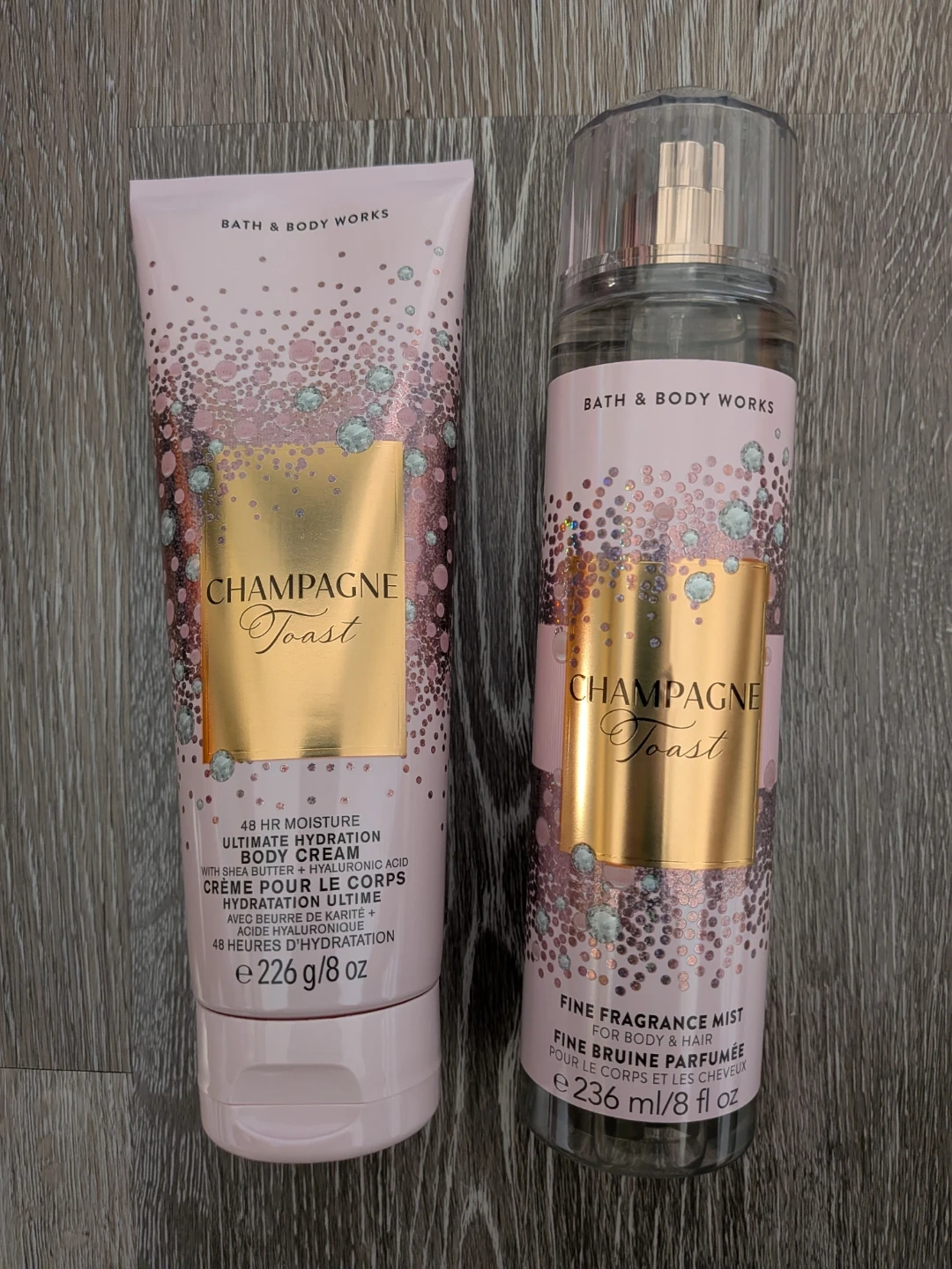 Selling a Bath & Body Works Champagne Toast set! Includes a body cream (226 g/8 oz) and a fine fragrance mist (236 ml/8 fl oz). Perfect for layering your favourite scent!