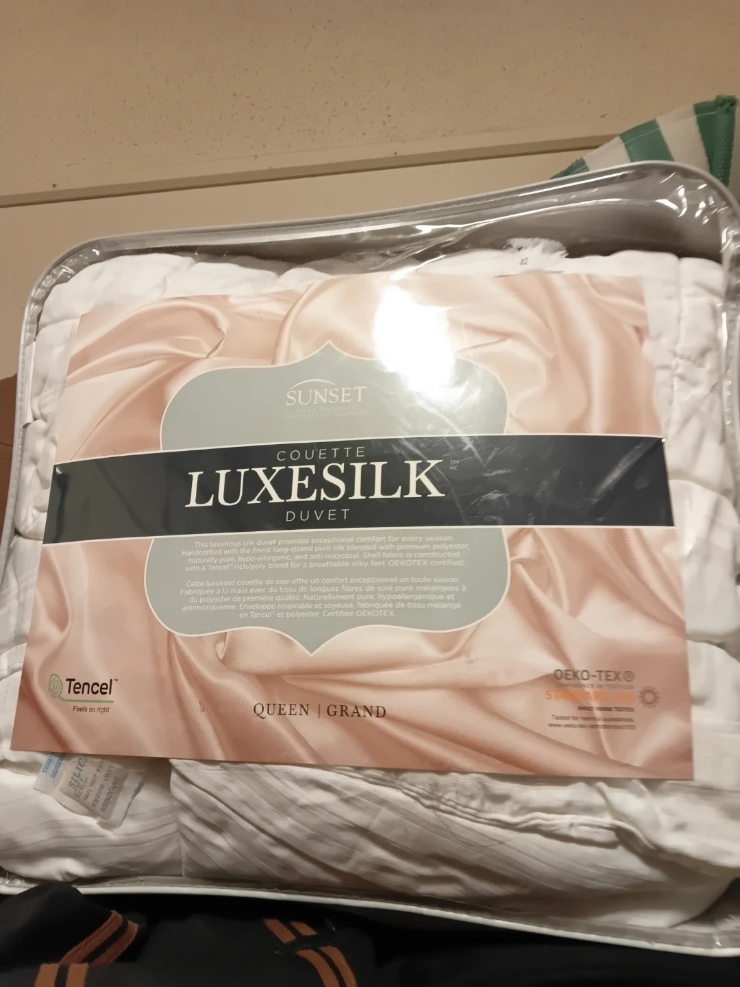 Selling a brand new Sunset LuxeSilk duvet, still sealed in its original packaging! This is a queen size duvet, crafted with a blend of silk and polyester for a breathable, silky feel. It's naturally pure, hypoallergenic, and antimicrobial too