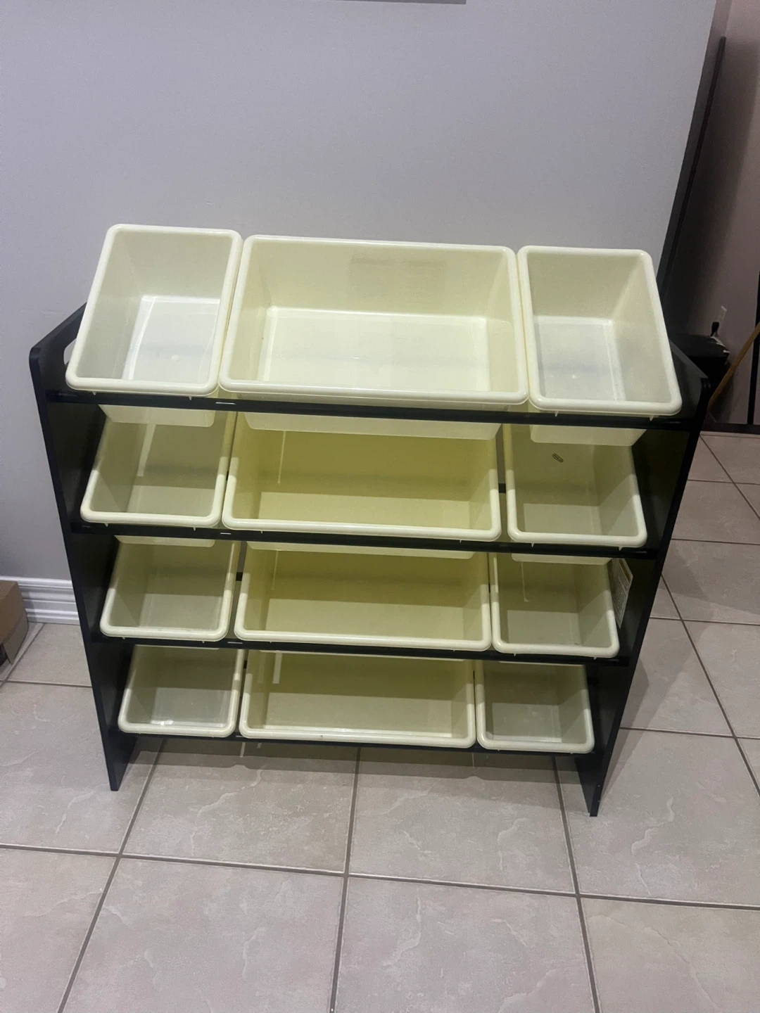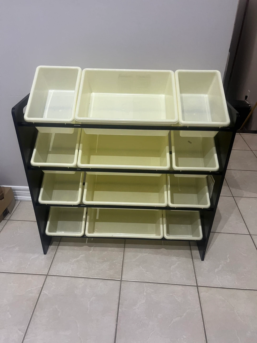 This multi-level toy organizer features a black frame and 12 removable plastic bins in a light cream colour. It's designed for easy storage and access to toys. The bins come in three different sizes for varied storage needs. Perfect for keeping playrooms tidy!
