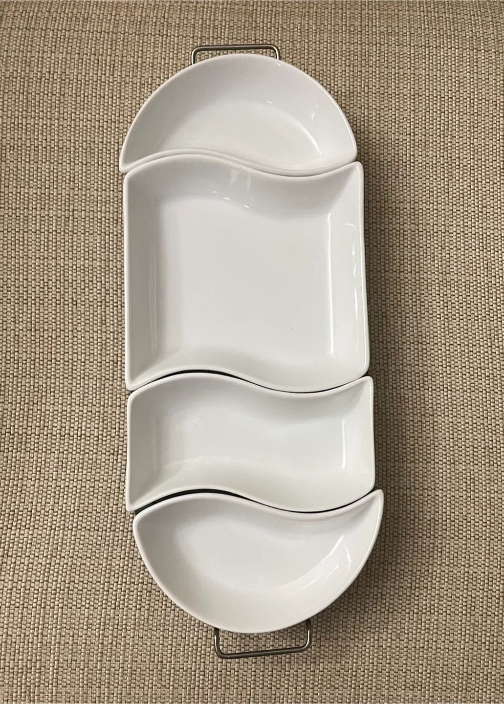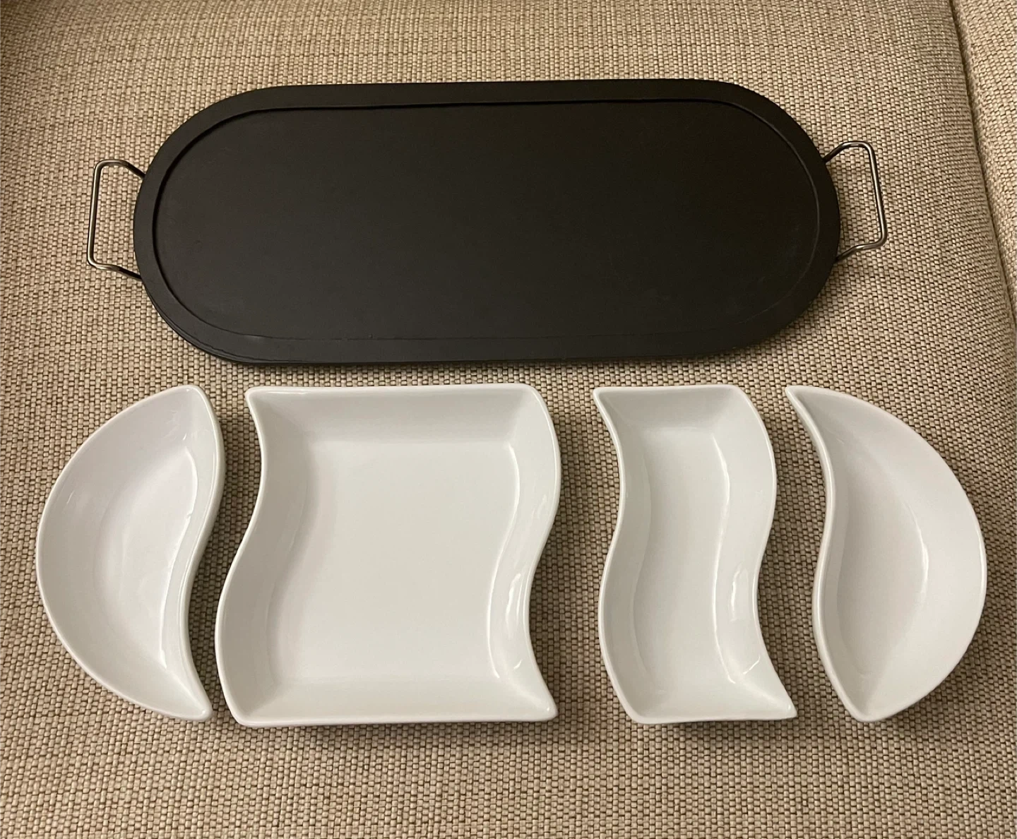 A white ceramic 5-piece appetizer serving platter set. It includes five small separate dishes that fit onto a black wooden tray with handles. Perfect for serving snacks or dips at gatherings. Excellent condition, like new. Rarely used. From smoke-free, pest-free, and pet-free home.