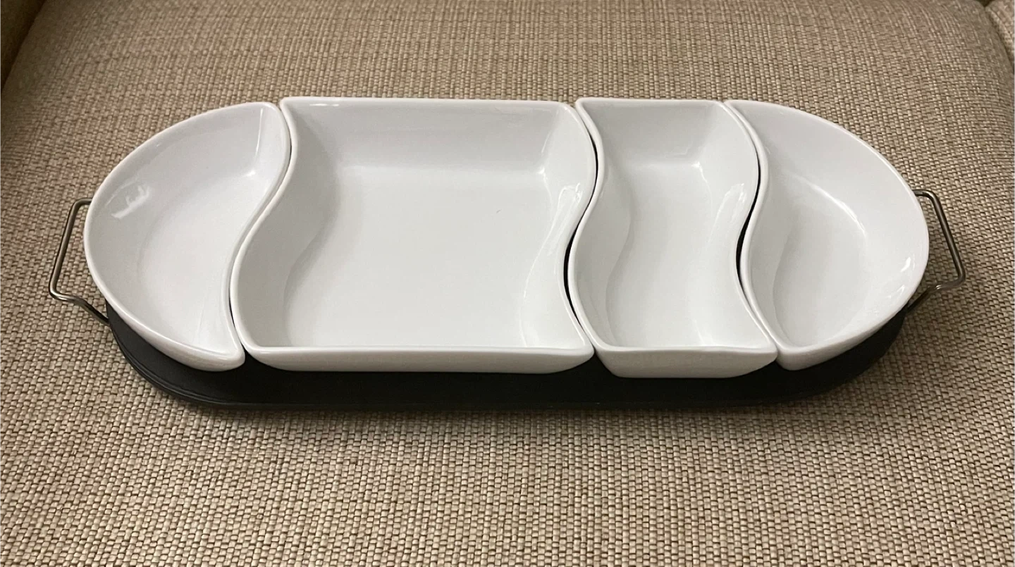A white ceramic 5-piece appetizer serving platter set. It includes five small separate dishes that fit onto a black wooden tray with handles. Perfect for serving snacks or dips at gatherings. Excellent condition, like new. Rarely used. From smoke-free, pest-free, and pet-free home.