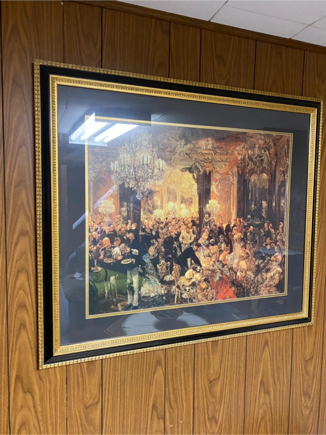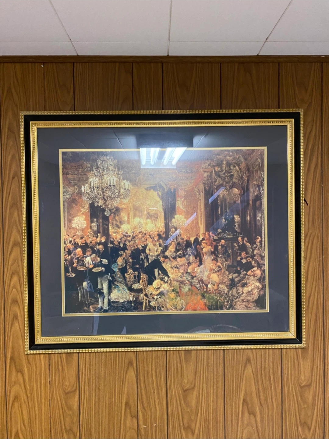 This framed art print depicts a lively vintage ball scene with a grand chandelier and many people. It's housed in a black and gold frame. The print has a classic, detailed style.