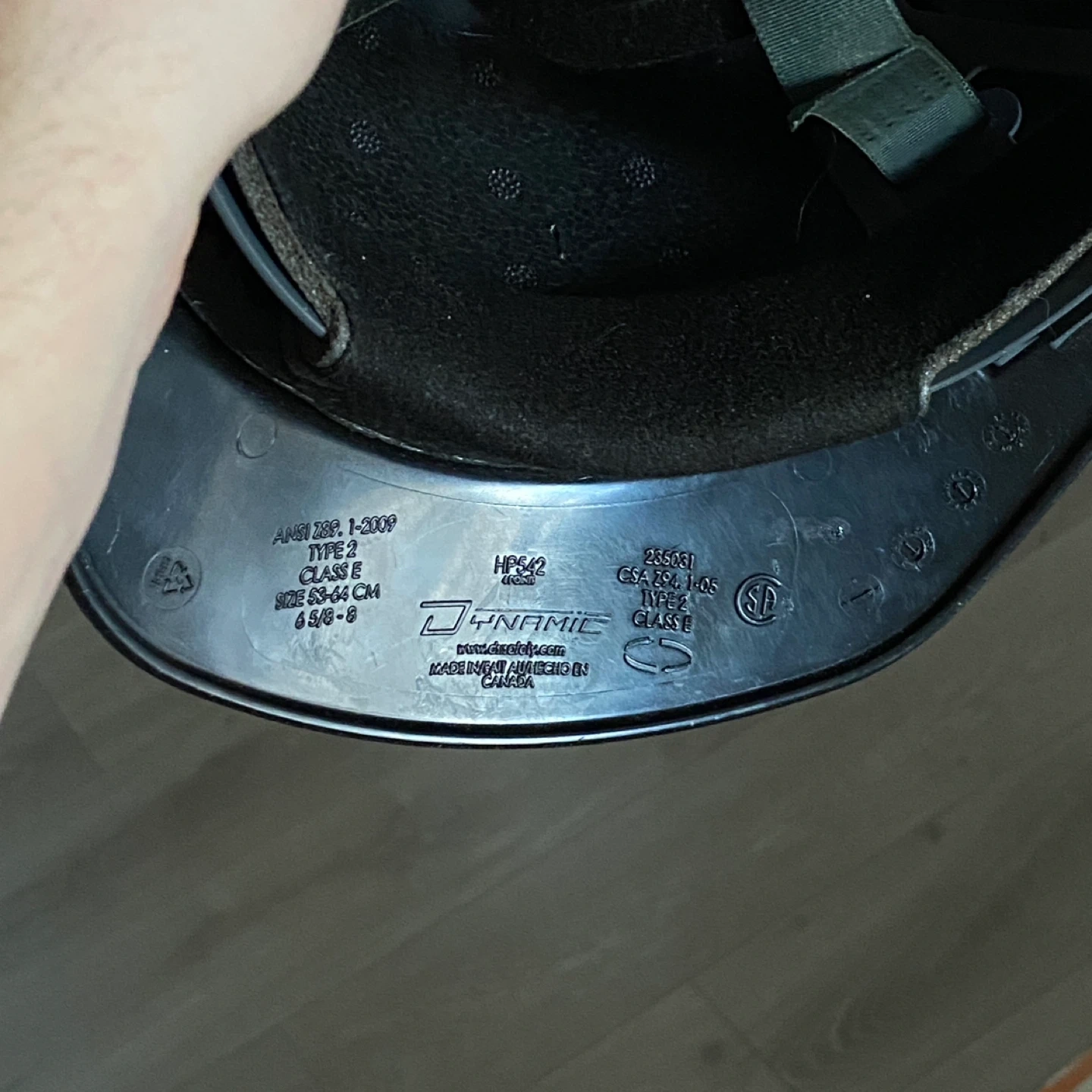 This is a black Dynamic hard hat. It meets ANSI Z89.1-2009 Type 2 Class E standards. The size is 53-64 cm, or 6 5/8-8 inches. It's made in Canada.