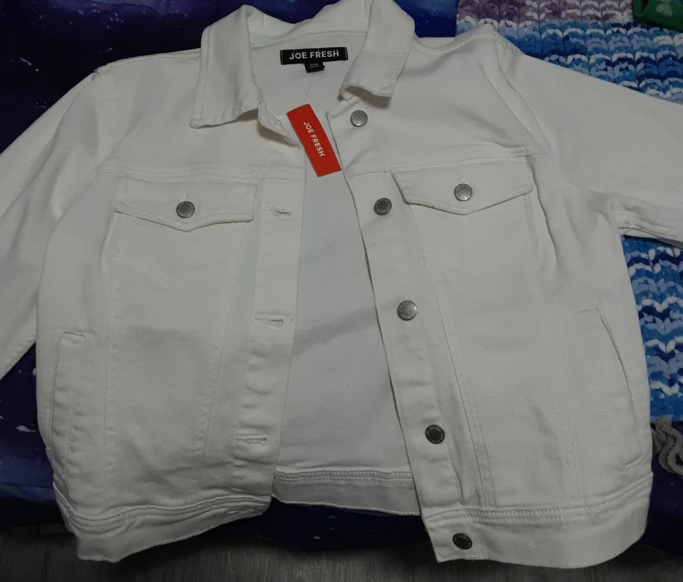 Classic white denim jacket from Joe Fresh. It's a stylish and versatile piece for any wardrobe. Button-front closure with two chest pockets and side pockets.