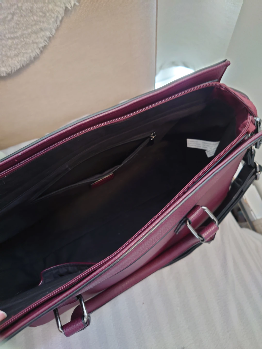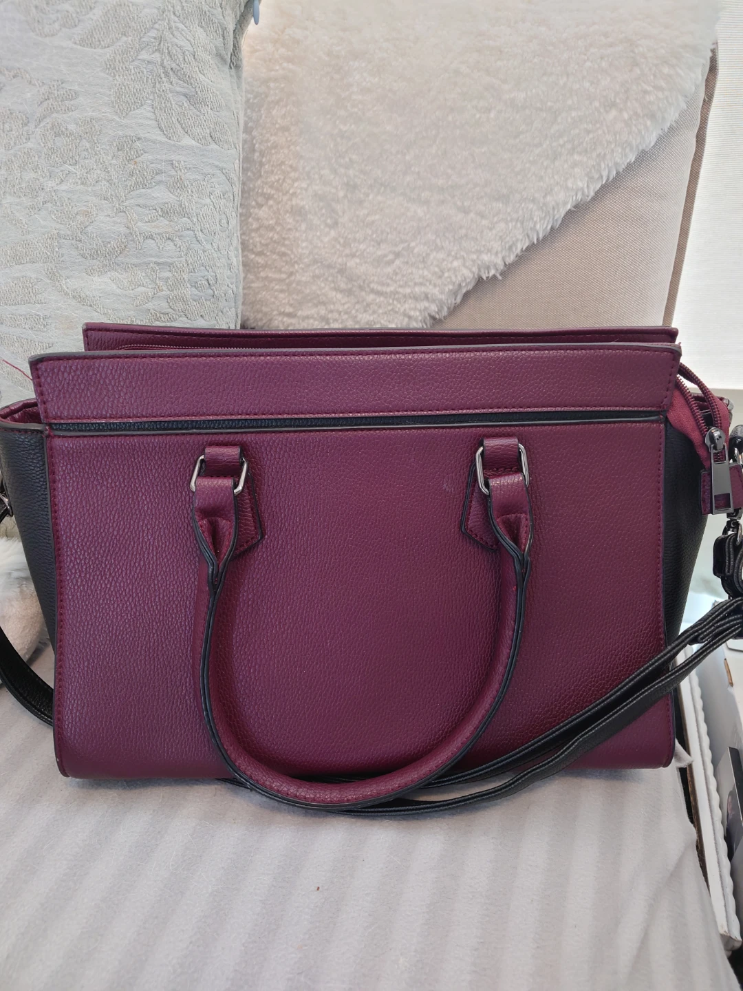 Stylish faux leather tote bag in a deep burgundy and black colour. Top zip closure.