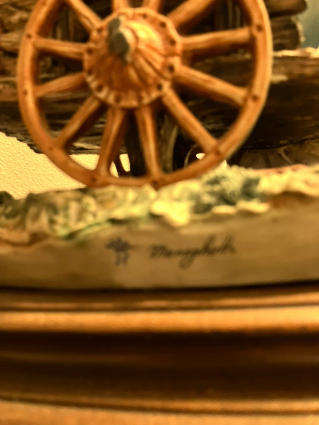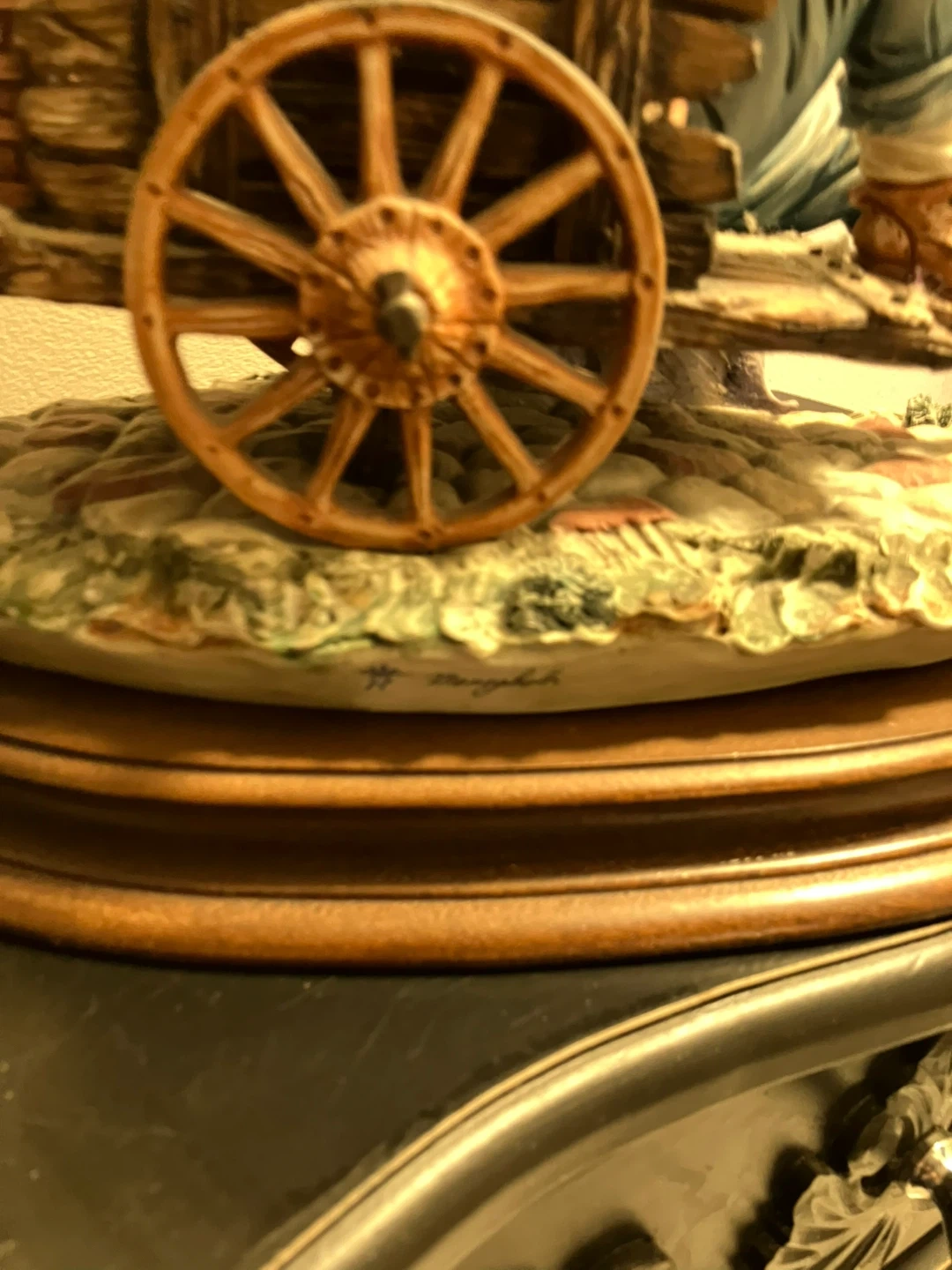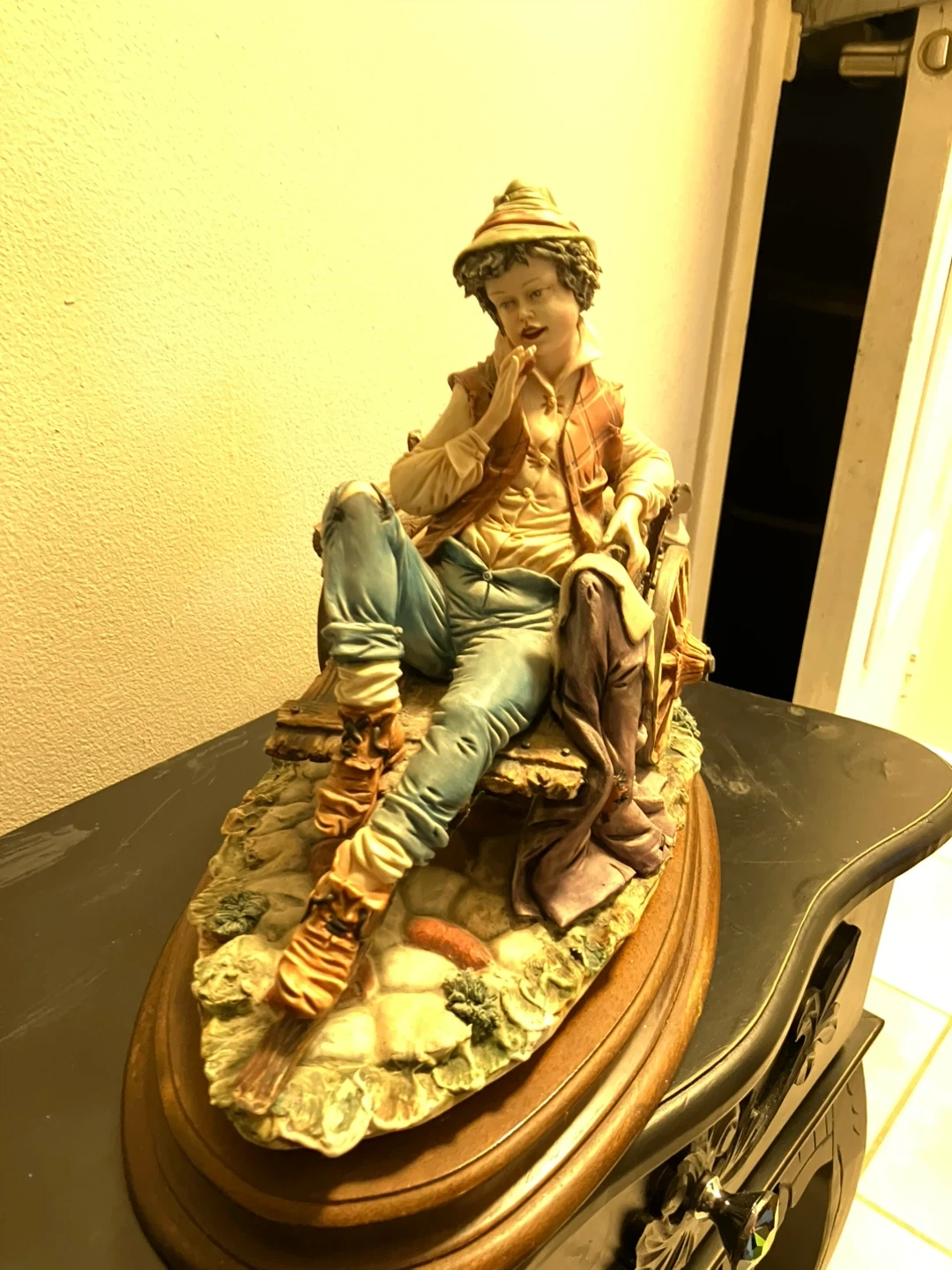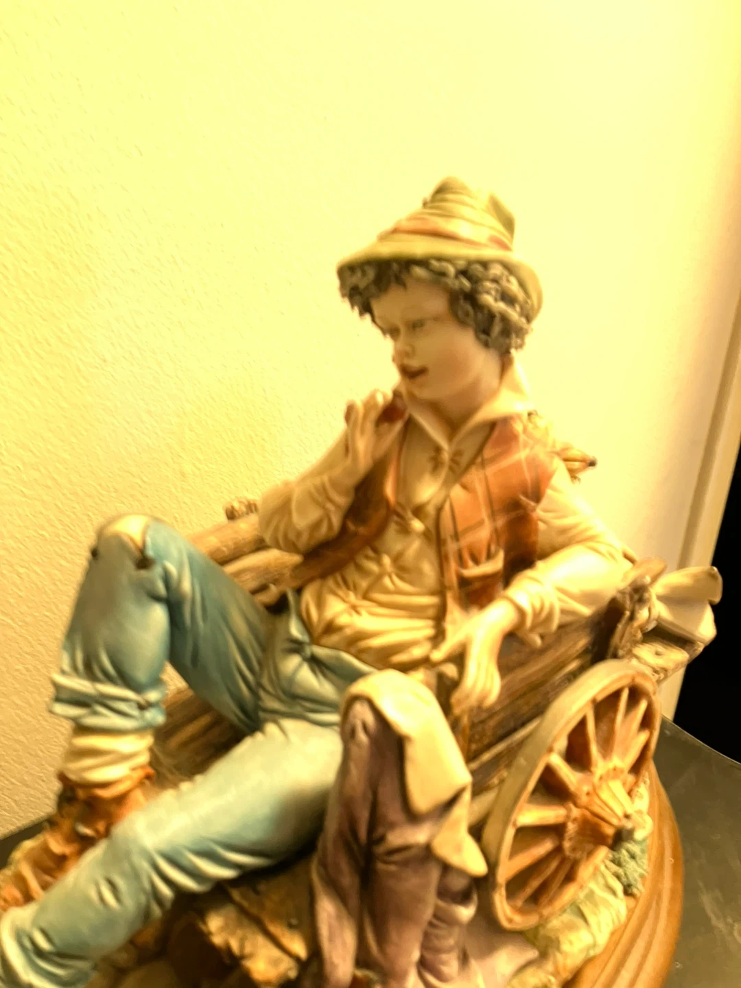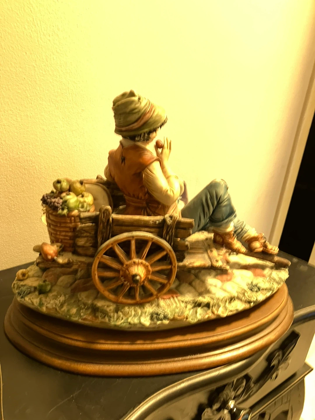 Selling a Capodimonte boy in apple cart figurine with a basket of fruit. The figurine is in very good condition signed Meneghetti and would make a great addition to any collection