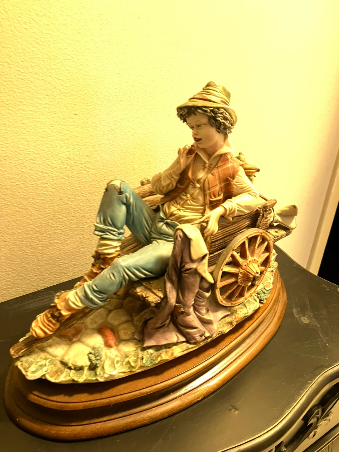 Selling a Capodimonte boy in apple cart figurine with a basket of fruit. The figurine is in very good condition signed Meneghetti and would make a great addition to any collection