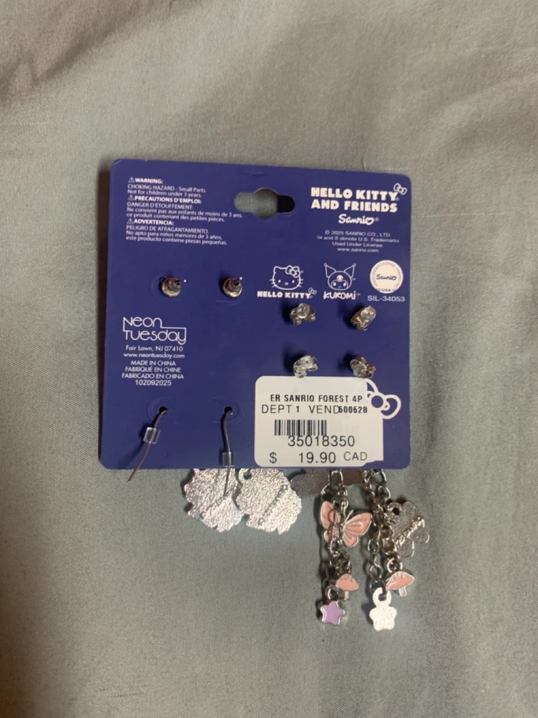 Includes several pairs of earrings with different designs, like Hello Kitty, Kuromi, butterflies, and pearls. Perfect for any Hello Kitty fan!