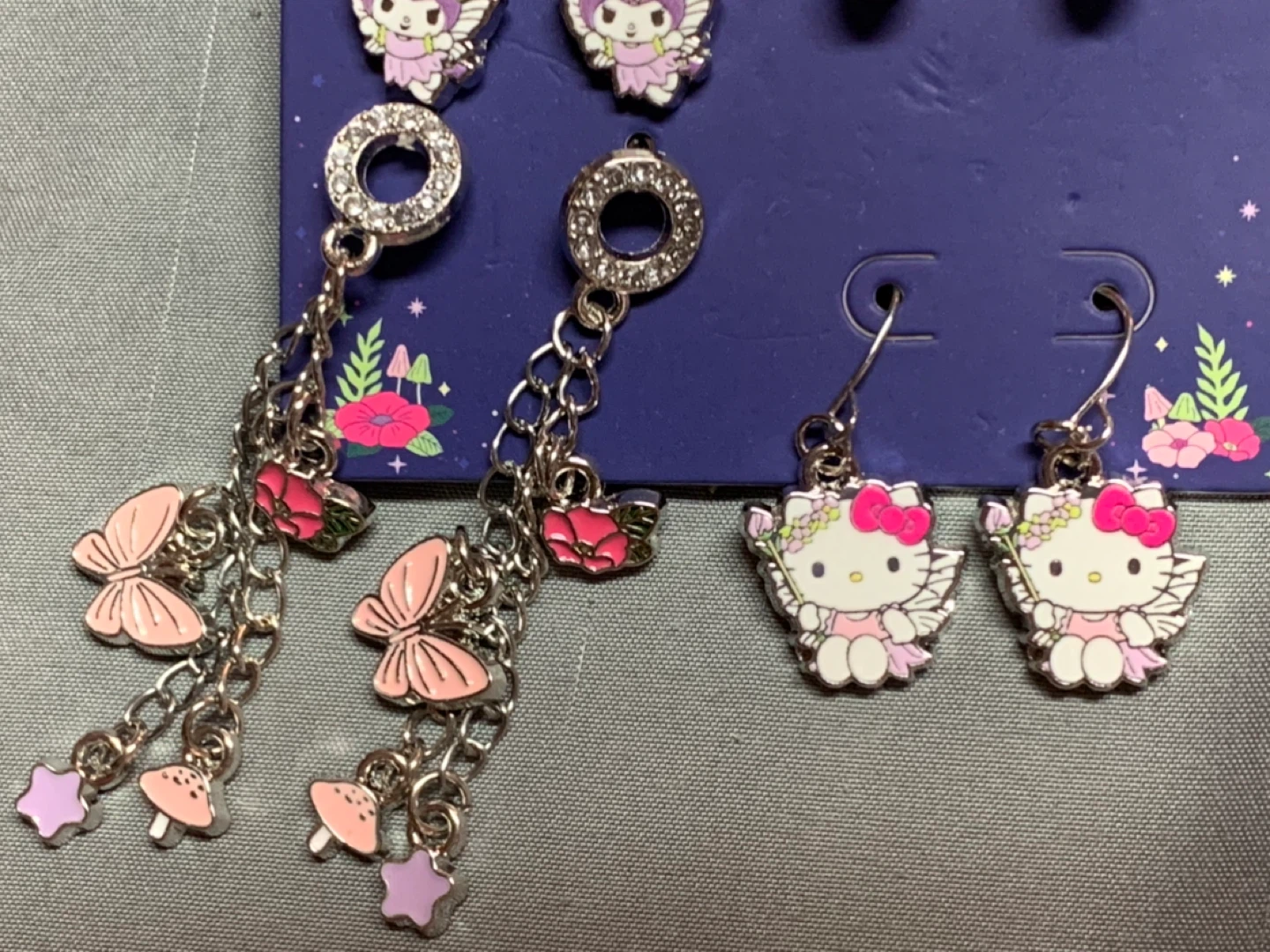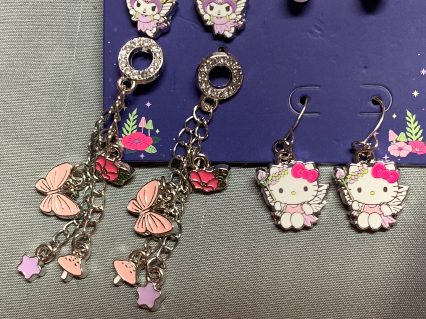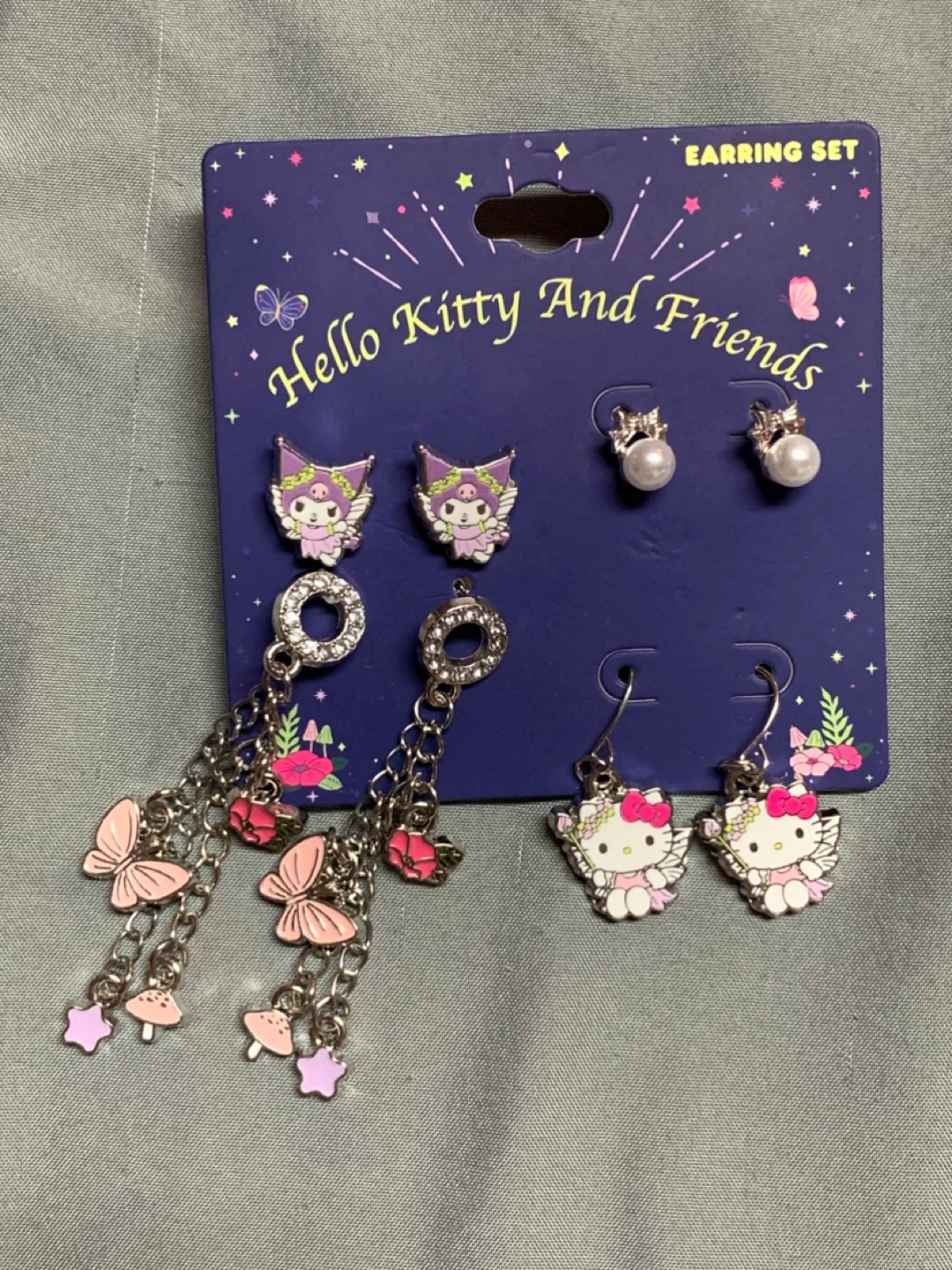 Includes several pairs of earrings with different designs, like Hello Kitty, Kuromi, butterflies, and pearls. Perfect for any Hello Kitty fan!