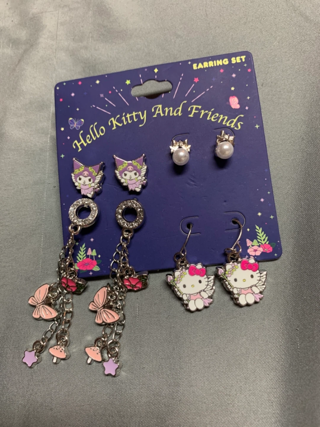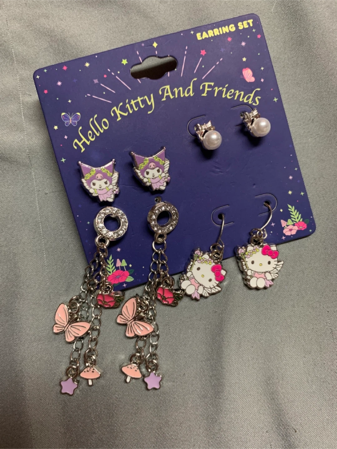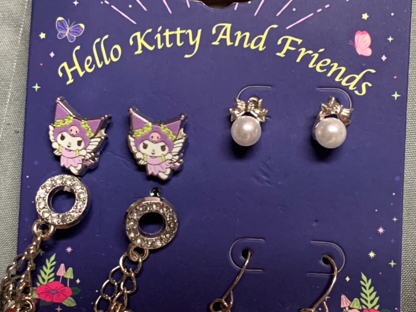 Includes several pairs of earrings with different designs, like Hello Kitty, Kuromi, butterflies, and pearls. Perfect for any Hello Kitty fan!