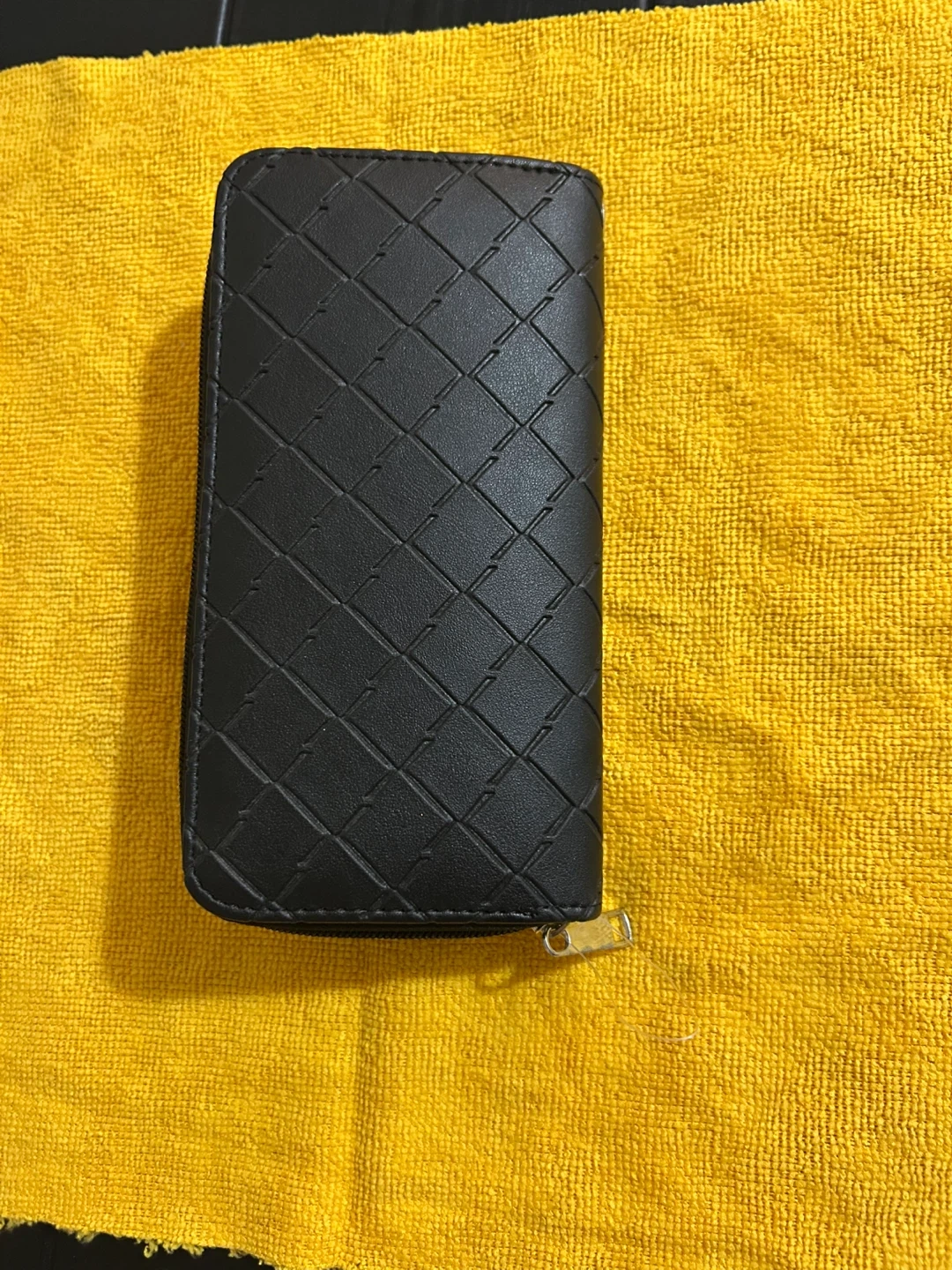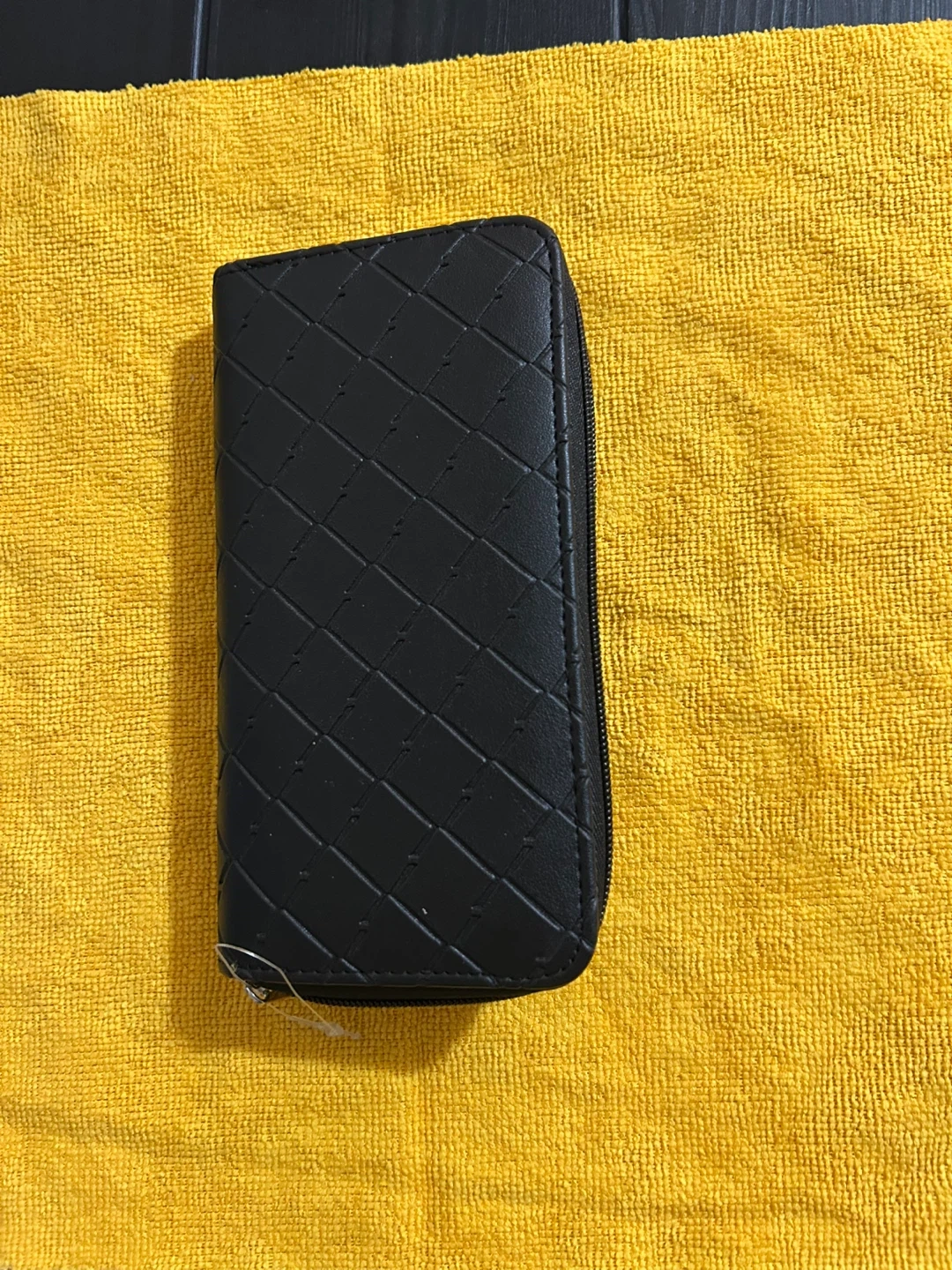 This black clutch wallet has a diamond-patterned exterior and a convenient wrist strap. It features multiple compartments and a zippered coin pocket inside. It's perfect for keeping your essentials organized on the go!