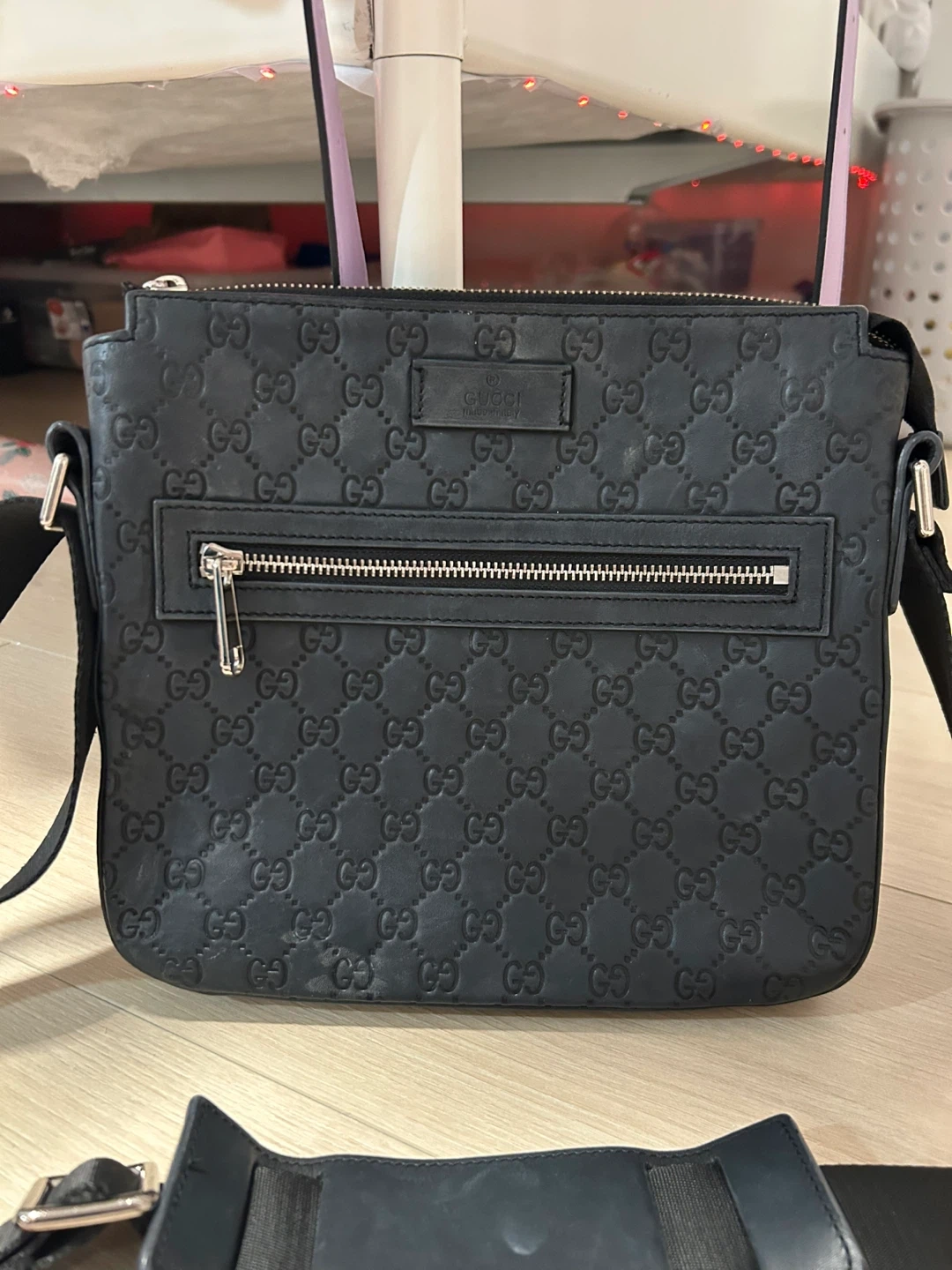 Authentic Gucci messenger bag in black leather. Features the iconic GG monogram pattern embossed all over. It has a zippered front pocket and a main zippered compartment. Made in Italy. This bag is perfect for everyday use, offering a stylish way to carry your essentials.