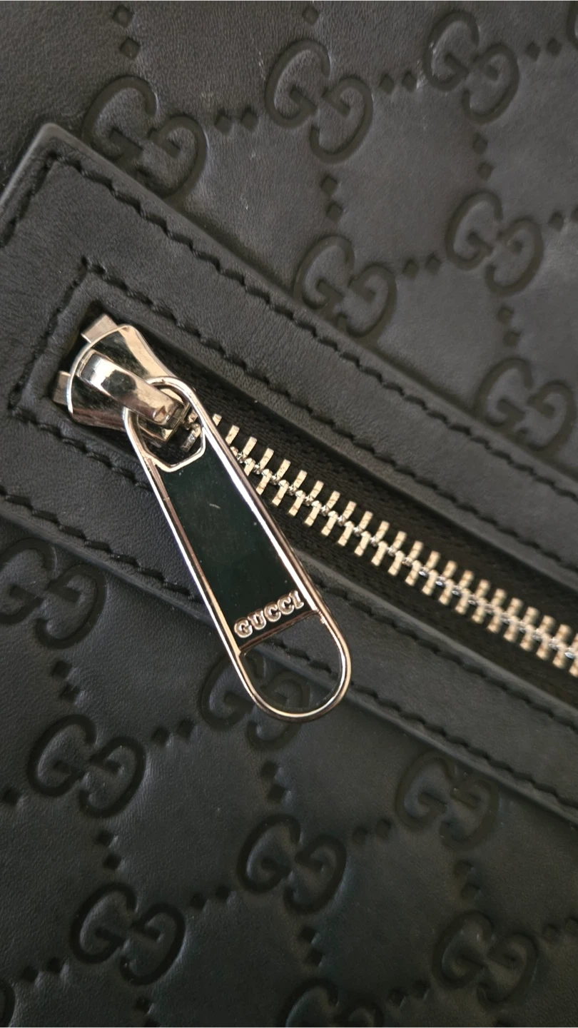 Authentic Gucci messenger bag in black leather. Features the iconic GG monogram pattern embossed all over. It has a zippered front pocket and a main zippered compartment. Made in Italy. This bag is perfect for everyday use, offering a stylish way to carry your essentials.
