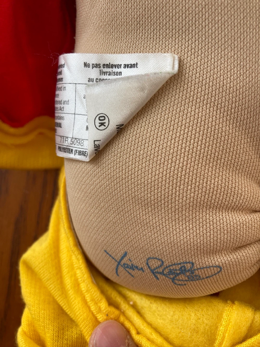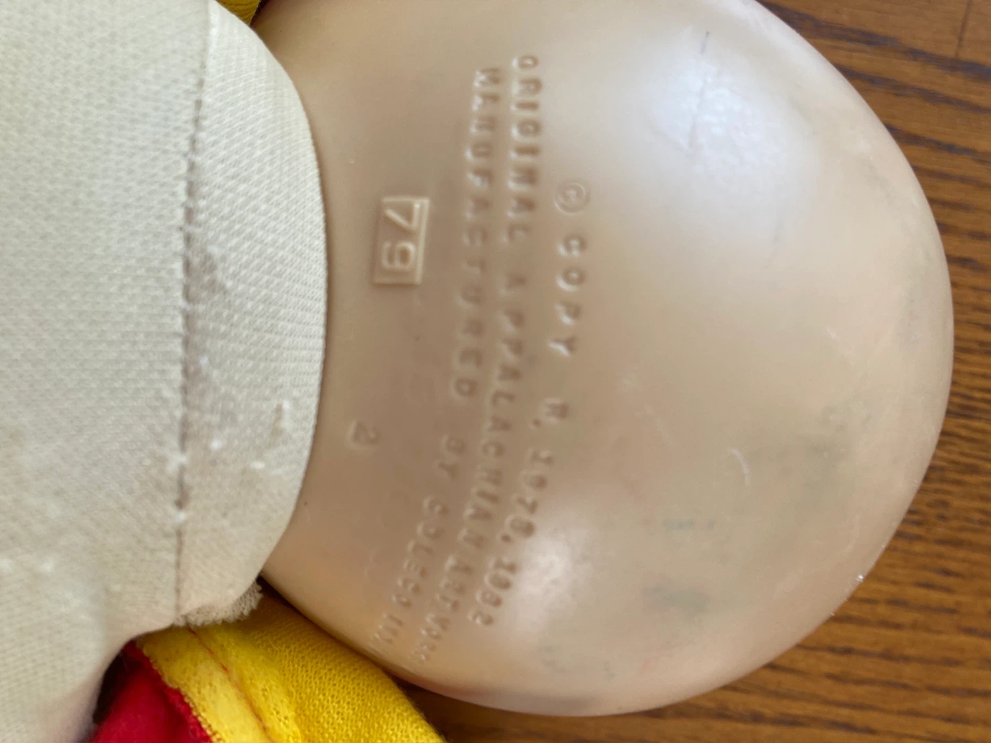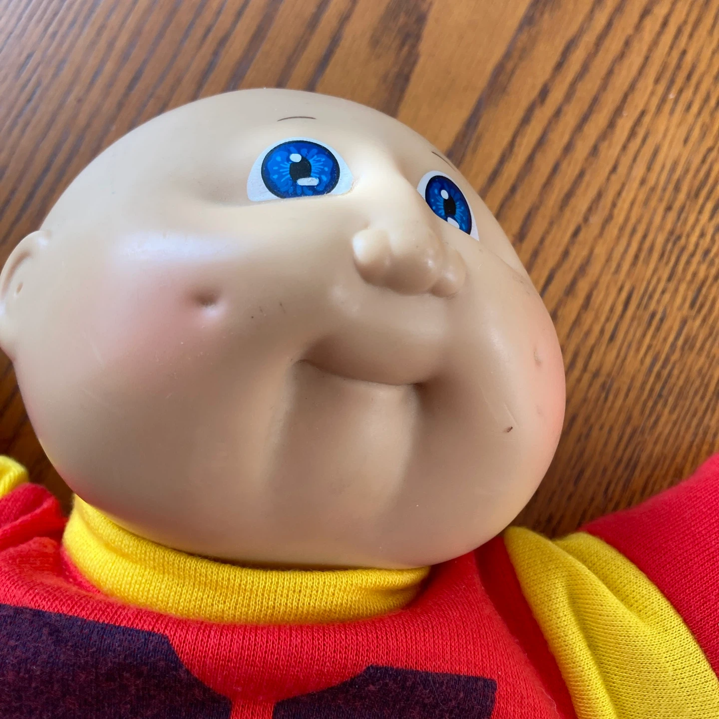 This is a Cabbage Patch Kid doll from 1985. It's wearing a red and yellow outfit with the number 31 on the front. The doll's body is made of polyester fibre.